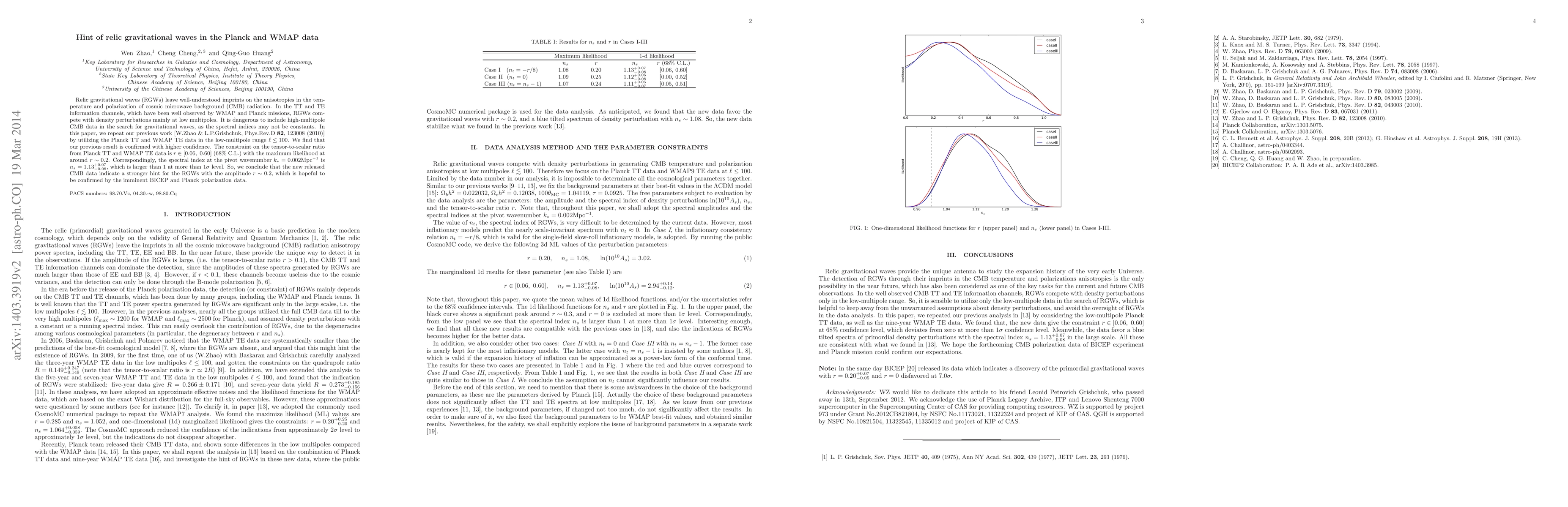 Relic gravitational waves (RGWs) leave well-understood imprints on the anisotropies in the temperature and polarization of cosmic microwave background (CMB) radiation. In the TT and TE information channels, which have been well observed by WMAP and Planck missions, RGWs compete with density perturbations mainly at low multipoles. It is dangerous to include high-multipole CMB data in the search for gravitational waves, as the spectral indices may not be constants. In this paper, we repeat our previous work [W.Zhao & L.P.Grishchuk, Phys.Rev.D {\bf 82}, 123008 (2010)] by utilizing the Planck TT and WMAP TE data in the low-multipole range $\ell\le100$. We find that our previous result is confirmed {with higher confidence}. The constraint on the tensor-to-scalar ratio from Planck TT and WMAP TE data is $r\in [0.06,~0.60]$ (68% C.L.) with the maximum likelihood at around $r\sim 0.2$. Correspondingly, the spectral index at the pivot wavenumber $k_*=0.002$Mpc$^{-1}$ is $n_s=1.13^{+0.07}_{-0.08}$, which is larger than 1 at more than $1\sigma$ level. So, we conclude that the new released CMB data indicate a stronger hint for the RGWs with the amplitude $r\sim 0.2$, which is hopeful to be confirmed by the imminent BICEP and Planck polarization data.