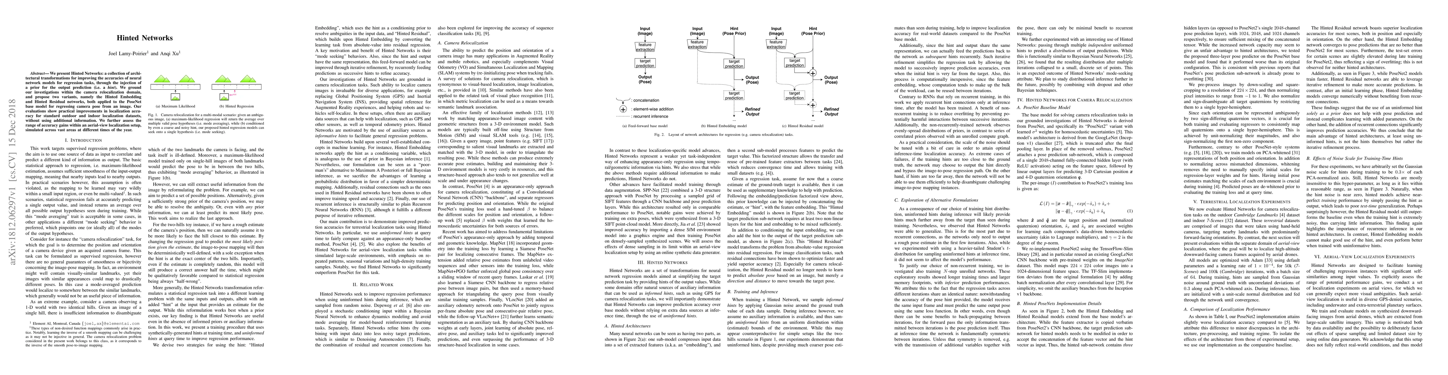 Hinted Networks introduce architectural transformations to enhance neural network accuracy for regression tasks by incorporating prior knowledge (hints) into the model. Applied to the PoseNet model for camera relocalization, the Hinted Embedding and Hinted Residual networks show improved localization accuracy across various datasets and aerial-view simulations.
