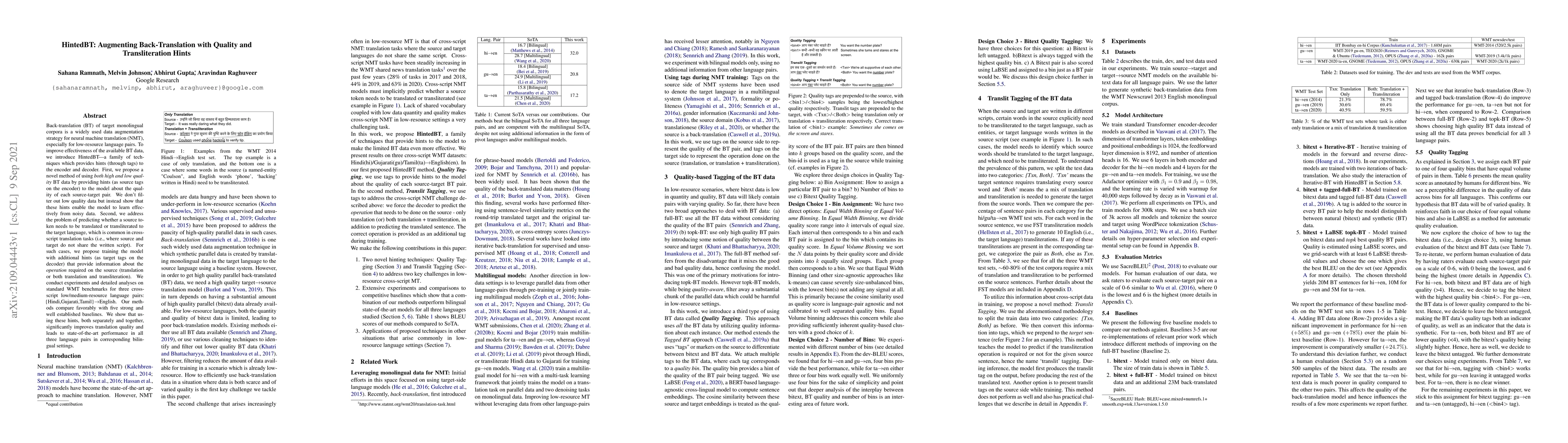Back-translation (BT) of target monolingual corpora is a widely used data augmentation strategy for neural machine translation (NMT), especially for low-resource language pairs. To improve effectiveness of the available BT data, we introduce HintedBT -- a family of techniques which provides hints (through tags) to the encoder and decoder. First, we propose a novel method of using both high and low quality BT data by providing hints (as source tags on the encoder) to the model about the quality of each source-target pair. We don't filter out low quality data but instead show that these hints enable the model to learn effectively from noisy data. Second, we address the problem of predicting whether a source token needs to be translated or transliterated to the target language, which is common in cross-script translation tasks (i.e., where source and target do not share the written script). For such cases, we propose training the model with additional hints (as target tags on the decoder) that provide information about the operation required on the source (translation or both translation and transliteration). We conduct experiments and detailed analyses on standard WMT benchmarks for three cross-script low/medium-resource language pairs: {Hindi,Gujarati,Tamil}-to-English. Our methods compare favorably with five strong and well established baselines. We show that using these hints, both separately and together, significantly improves translation quality and leads to state-of-the-art performance in all three language pairs in corresponding bilingual settings.
