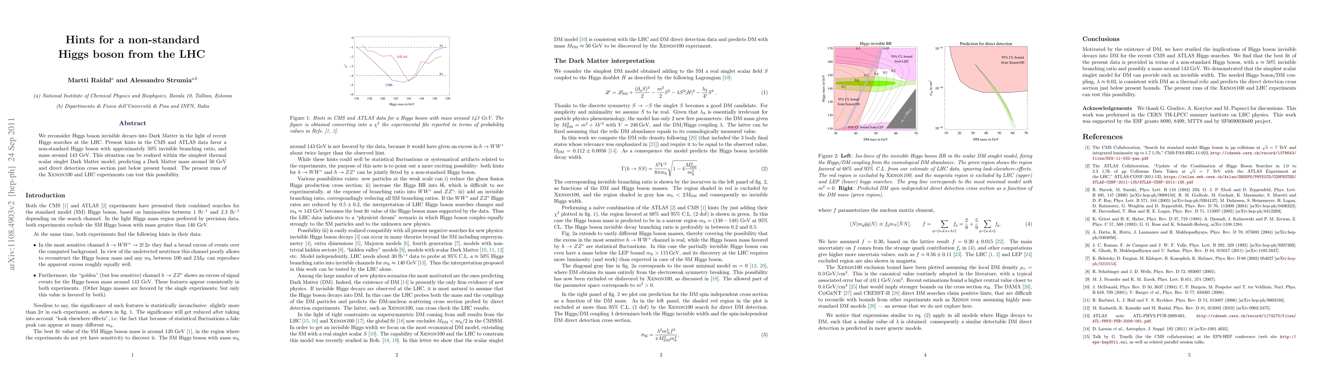 We reconsider Higgs boson invisible decays into Dark Matter in the light of recent Higgs searches at the LHC. Present hints in the CMS and ATLAS data favor a non-standard Higgs boson with approximately 50% invisible branching ratio, and mass around 143 GeV. This situation can be realized within the simplest thermal scalar singlet Dark Matter model, predicting a Dark Matter mass around 50 GeV and direct detection cross section just below present bound. The present runs of the Xenon100 and LHC experiments can test this possibility.