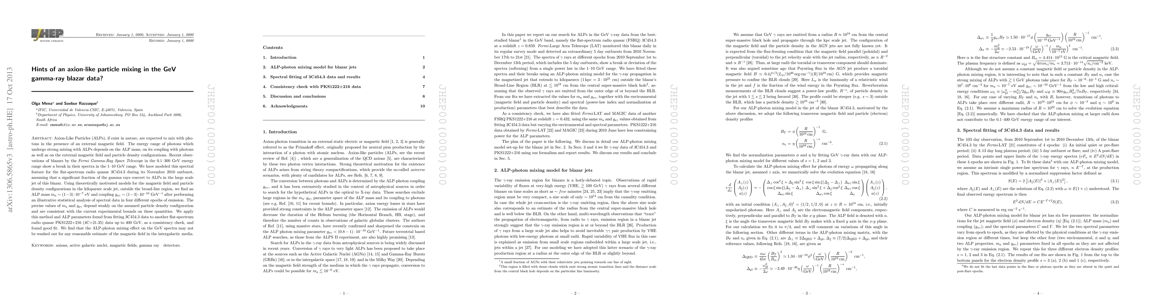 This paper investigates the possibility of Axion-Like Particles (ALPs) mixing with photons in the GeV gamma-ray spectra of blazars, particularly 3C454.3, suggesting ALP mass and coupling values consistent with current experimental bounds. The findings are validated by applying the same model to another blazar, PKS1222+216, showing good fit and indicating the ALP-photon mixing effect may persist in intergalactic magnetic fields.