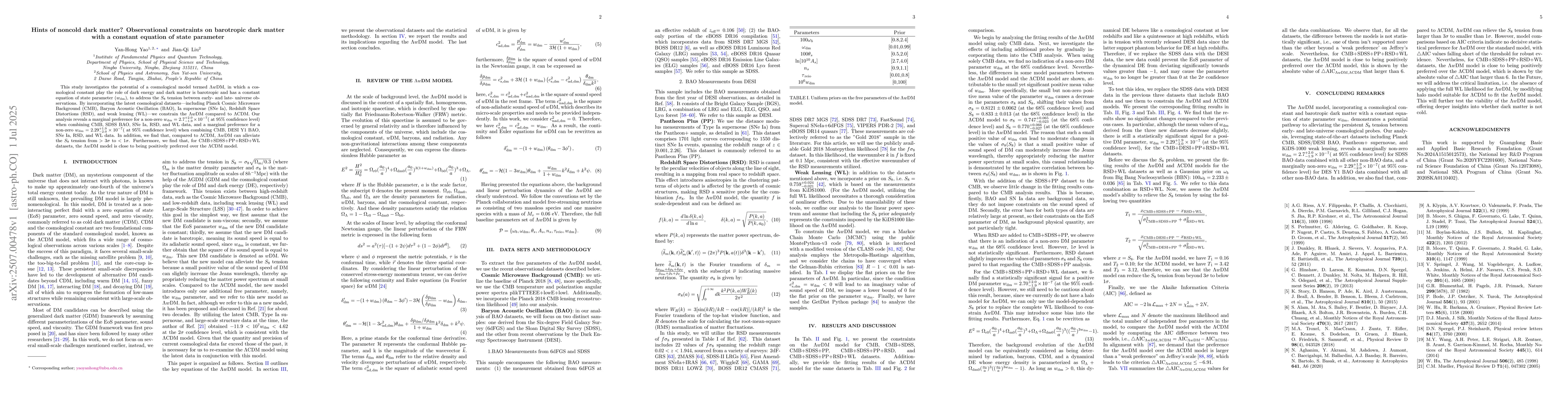 This study investigates the potential of a cosmological model termed $\Lambda w$DM, in which a cosmological constant play the role of dark energy and dark matter is barotropic and has a constant equation of state parameter ($w_{\rm dm}$), to address the $S_8$ tension between early- and late- universe observations. By incorporating the latest cosmological datasets -- including Planck Cosmic Microwave Background (CMB), Baryon Acoustic Oscillation (BAO), Ia supernovae (SNe Ia), Redshift Space Distortions (RSD), and weak lensing (WL) -- we constrain the $\Lambda w$DM compared to $\Lambda$CDM. Our analysis reveals a marginal preference for a non-zero $w_{\rm dm}=2.7^{+2.0}_{-1.9}\times10^{-7}$( at 95\% confidence level) when combining CMB, SDSS BAO, SNe Ia, RSD, and WL data, and a marginal preference for a non-zero $w_{\rm dm} = 2.29^{+1.9}_{-2.0} \times 10^{-7}$( at 95\% confidence level) when combining CMB, DESI Y1 BAO, SNe Ia, RSD, and WL data. In addition, we find that, compared to $\Lambda$CDM, $\Lambda w$DM can alleviate the $S_8$ tension from $>3\sigma$ to $<1\sigma$. Furthermore, we find that, for CMB+SDSS+PP+RSD+WL datasets, the $\Lambda w$DM model is close to being positively preferred over the $\Lambda$CDM model.