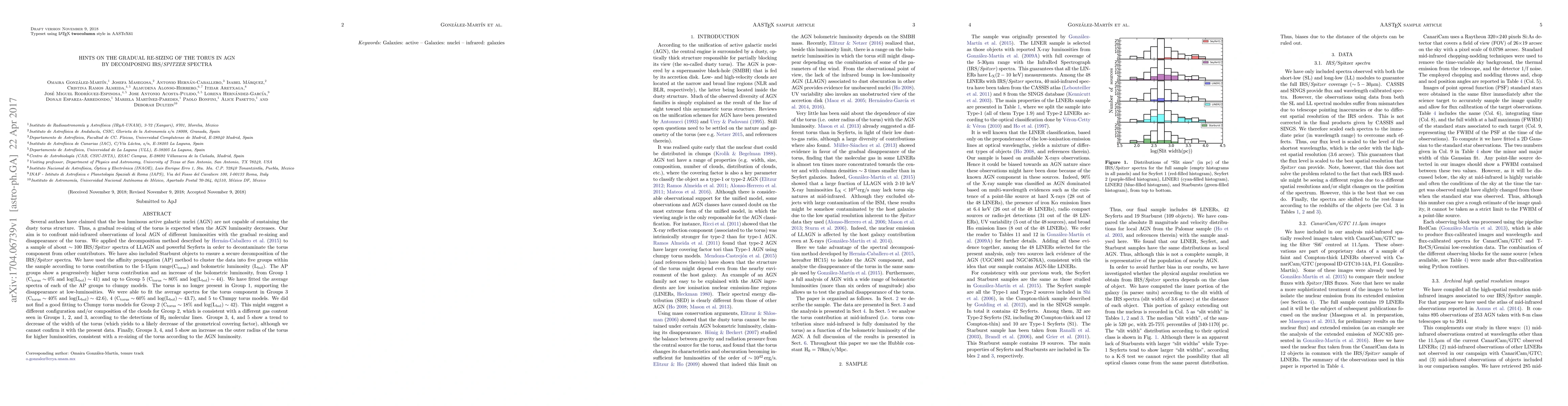 Several authors have claimed that the less luminous active galactic nuclei (AGN) are not capable of sustaining the dusty torus structure. Thus, a gradual re-sizing of the torus is expected when the AGN luminosity decreases. Our aim is to confront mid-infrared observations of local AGN of different luminosities with this scenario. We decomposed about ~100 IRS/Spitzer spectra of LLAGN and powerful Seyferts in order to decontaminate the torus component from other contributors. We have used the affinity propagation (AP) method to cluster the data into five groups within the sample according to torus contribution to the 5-15 um range (Ctorus) and bolometric luminosity. The AP groups show a progressively higher torus contribution and an increase of the bolometric luminosity, from Group 1 (Ctorus~ 0% and logLbol ~ 41) and up to Group 5 (Ctorus ~80% and log(Lbol) ~44). We have fitted the average spectra of each of the AP groups to clumpy models. The torus is no longer present in Group 1, supporting the disappearance at low-luminosities. We were able to fit the average spectra for the torus component in Groups 3 (Ctorus~ 40% and log(Lbol)~ 42.6), 4 (Ctorus~ 60% and log(Lbol)~ 43.7), and 5 to Clumpy torus models. We did not find a good fitting to Clumpy torus models for Group 2 (Ctorus~ 18% and log(Lbol)~ 42). This might suggest a different configuration and/or composition of the clouds for Group 2, which is consistent with a different gas content seen in Groups 1, 2, and 3, according to the detections of H2 molecular lines. Groups 3, 4, and 5 show a trend to decrease of the width of the torus (which yields to a likely decrease of the geometrical covering factor), although we cannot confirm it with the present data. Finally, Groups 3, 4, and 5 show an increase on the outer radius of the torus for higher luminosities, consistent with a re-sizing of the torus according to the AGN luminosity.