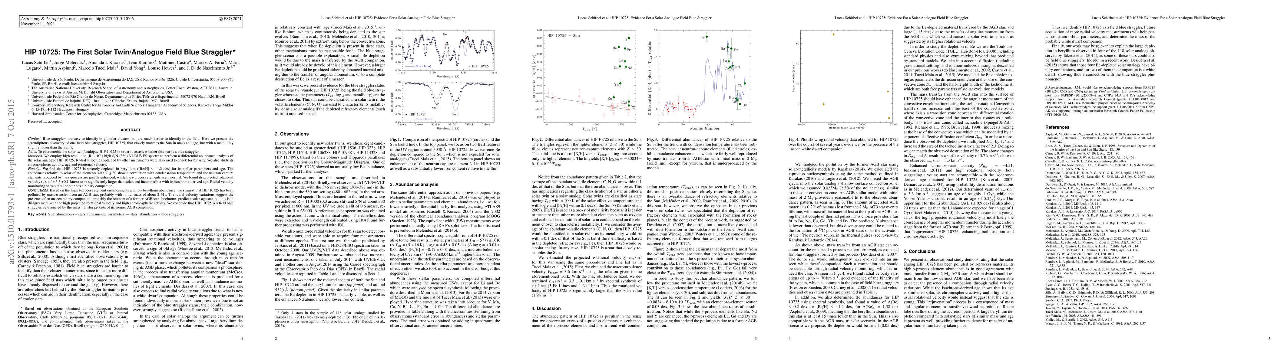 Astronomers discovered a field blue straggler star, HIP 10725, which closely matches the Sun in mass and age but has a slightly lower metallicity. The star's unusual properties suggest it was rejuvenated by mass transfer from an Asymptotic Giant Branch (AGB) star companion.