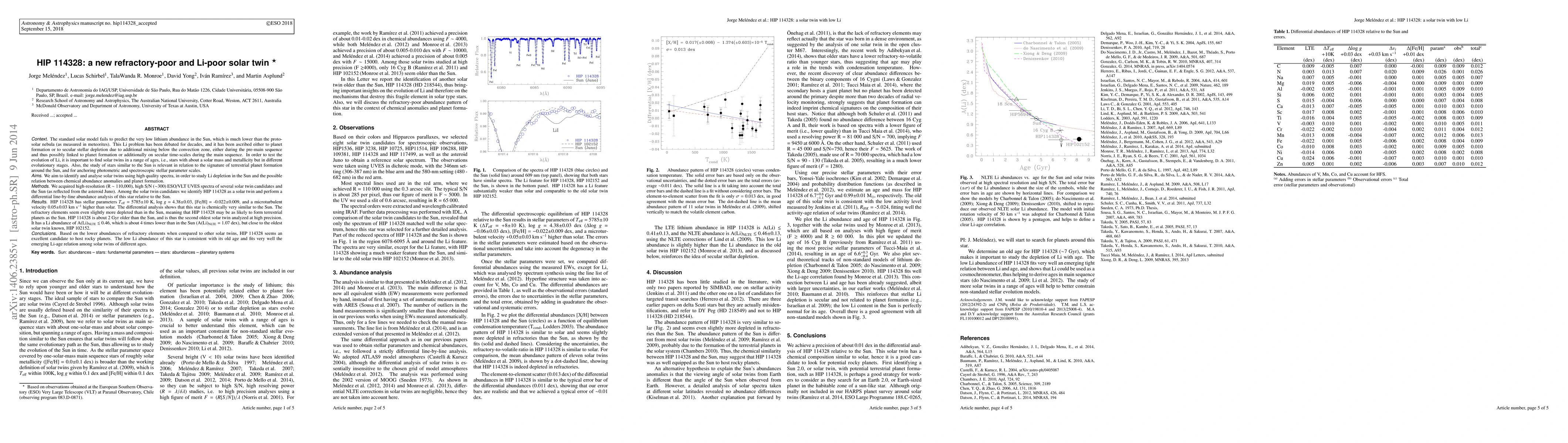 HIP 114328 is identified as a solar twin with low lithium and slightly depleted refractory elements, suggesting it may host terrestrial planets. Its low lithium abundance aligns with its age, supporting the Li-age relation among solar twins.