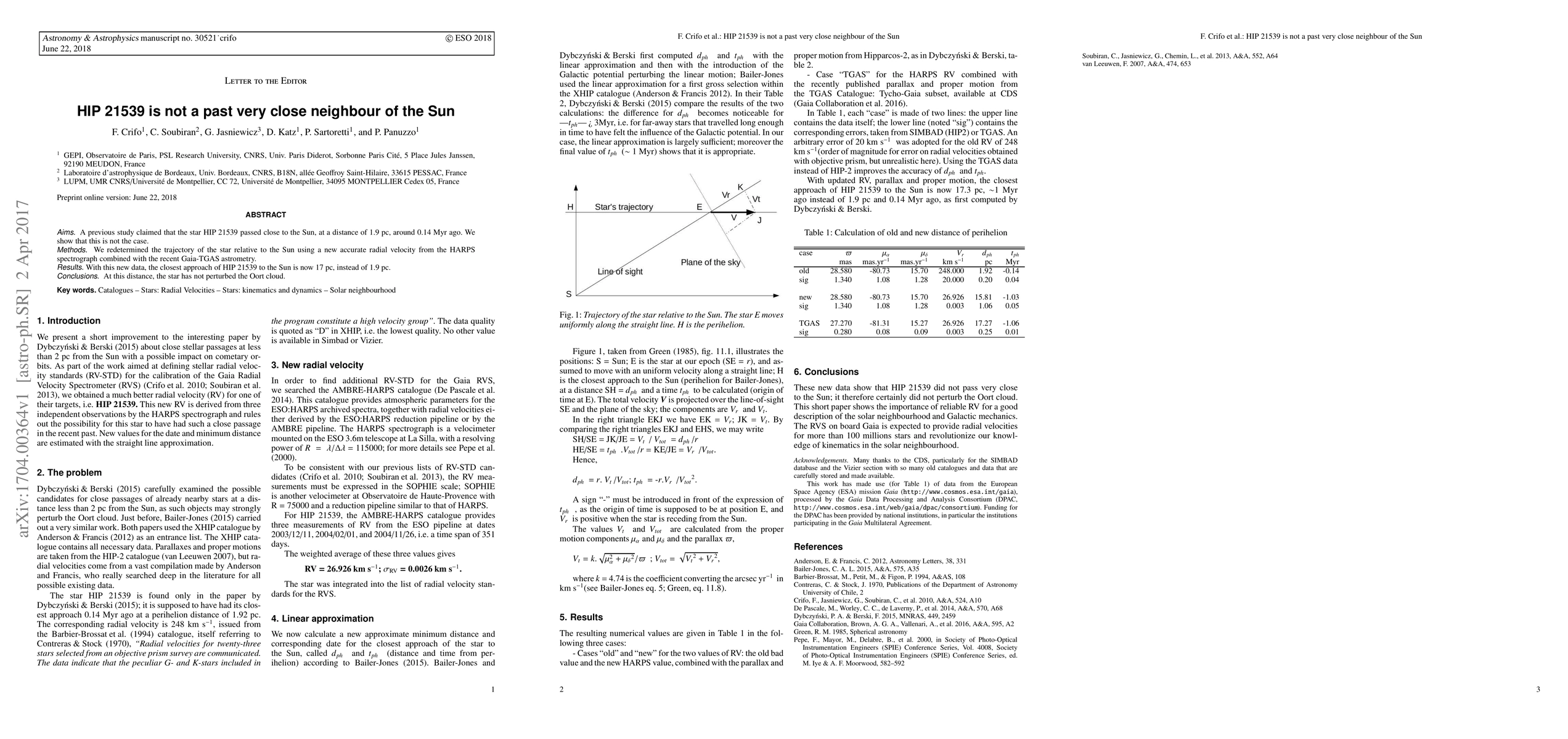 The research redetermined the trajectory of star HIP 21539 relative to the Sun using a new accurate radial velocity from the HARPS spectrograph combined with the recent Gaia-TGAS astrometry.
