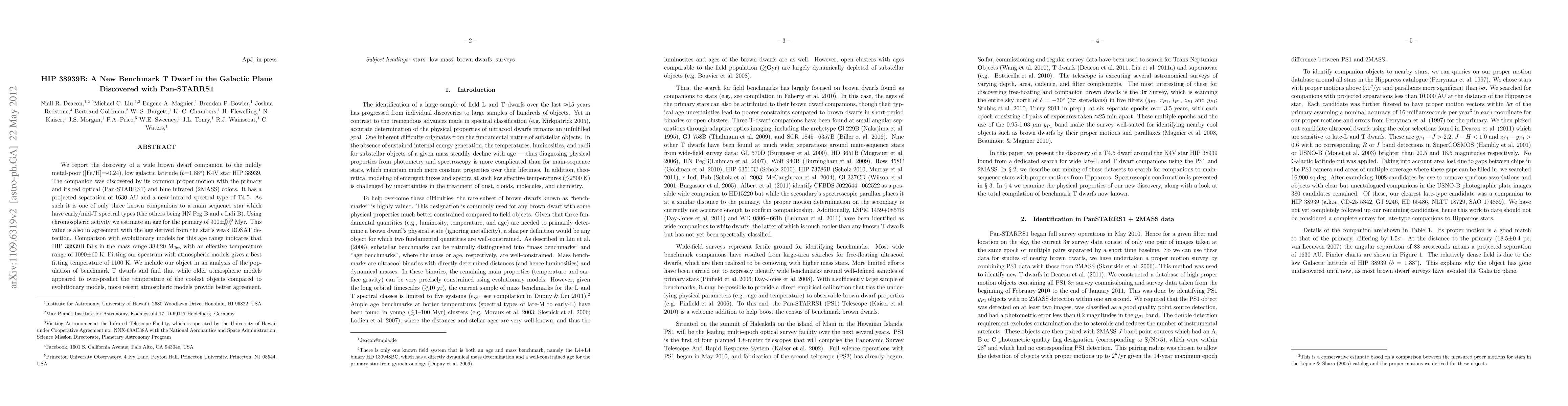 We report the discovery of a wide brown dwarf companion to the mildly metal-poor ([Fe/H]=-0.24), low galactic latitude (b = 1.88 deg) K4V star HIP 38939. The companion was discovered by its common proper motion with the primary and its red optical (Pan-STARRS1) and blue infrared (2MASS) colors. It has a projected separation of 1630 AU and a near-infrared spectral type of T4.5. As such it is one of only three known companions to a main sequence star which have early/mid-T spectral types (the others being HN Peg B and eps Indi B). Using chromospheric activity we estimate an age for the primary of 900{+1900,-600} Myr. This value is also in agreement with the age derived from the star's weak ROSAT detection. Comparison with evolutionary models for this age range indicates that HIP 38939B falls in the mass range 38+/-20 Mjup with an effective temperature range of 1090+/-60 K. Fitting our spectrum with atmospheric models gives a best fitting temperature of 1100 K. We include our object in an analysis of the population of benchmark T dwarfs and find that while older atmospheric models appeared to over-predict the temperature of the coolest objects compared to evolutionary models, more recent atmospheric models provide better agreement.