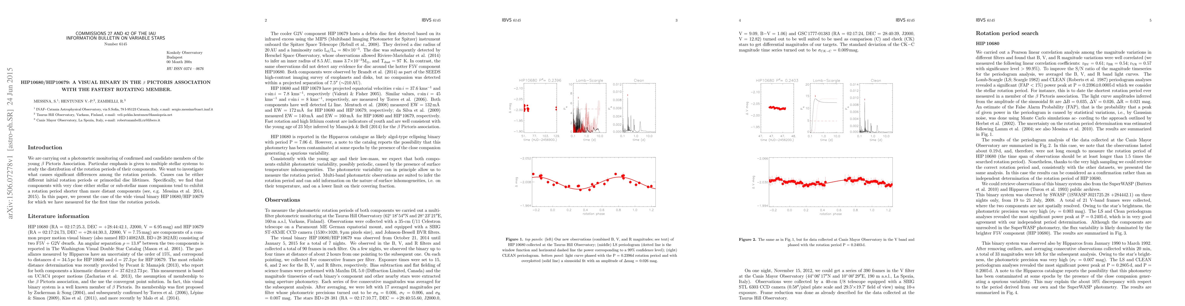 We present the results of a multi-filter photometric monitoring of the wide binary HIP10680/HIP10679. We found both component to be variable with amplitude up to $\Delta$V = 0.03 mag in the case of HIP10680 and $\Delta$V = 0.07 mag in the case of HIP10679. We could measure the rotation periods P = 0.2396d of the hotter F5V component HIP10680 and P = 0.777d of the cooler G5V component HIP10679. We found that the rotation axes of both components are aligned with an inclination $i$ = $\sim$ 10$^{\circ}$. Although the two components have a mass difference not larger than 15%, they exhibit a significant difference between their rotation periods. Such difference may arise either from different initial rotation periods or to different disc life times. For instance, the slower rotating component HIP 10679 hosts a well know debris disc.