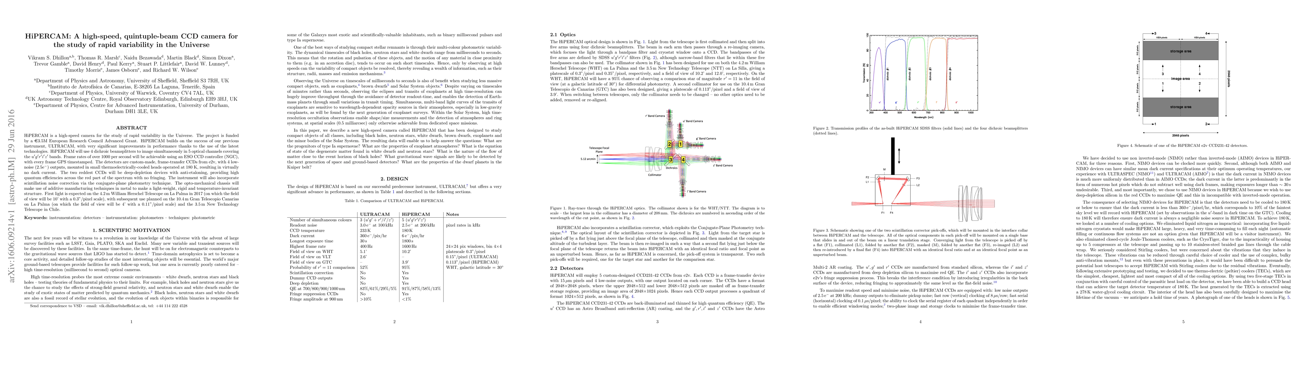 HiPERCAM is a high-speed, quintuple-beam CCD camera designed to study rapid variability in the Universe, featuring 4 dichroic beamsplitters for simultaneous imaging across five optical bands and frame rates exceeding 1000 per second. The instrument will be deployed on multiple telescopes, including the William Herschel Telescope and the Gran Telescopio Canarias.