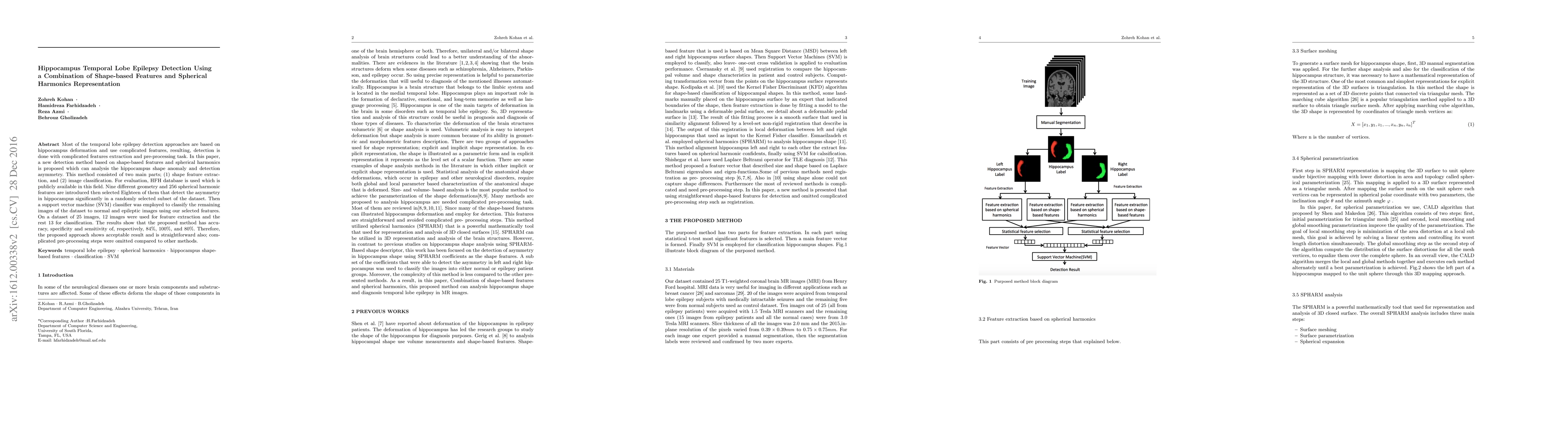 This paper proposes a novel method for detecting hippocampus temporal lobe epilepsy using shape-based features and spherical harmonics. The method extracts geometry and spherical harmonic features to identify asymmetry, employing an SVM classifier for classification, achieving 84% accuracy, 100% specificity, and 80% sensitivity, while simplifying pre-processing compared to existing methods.