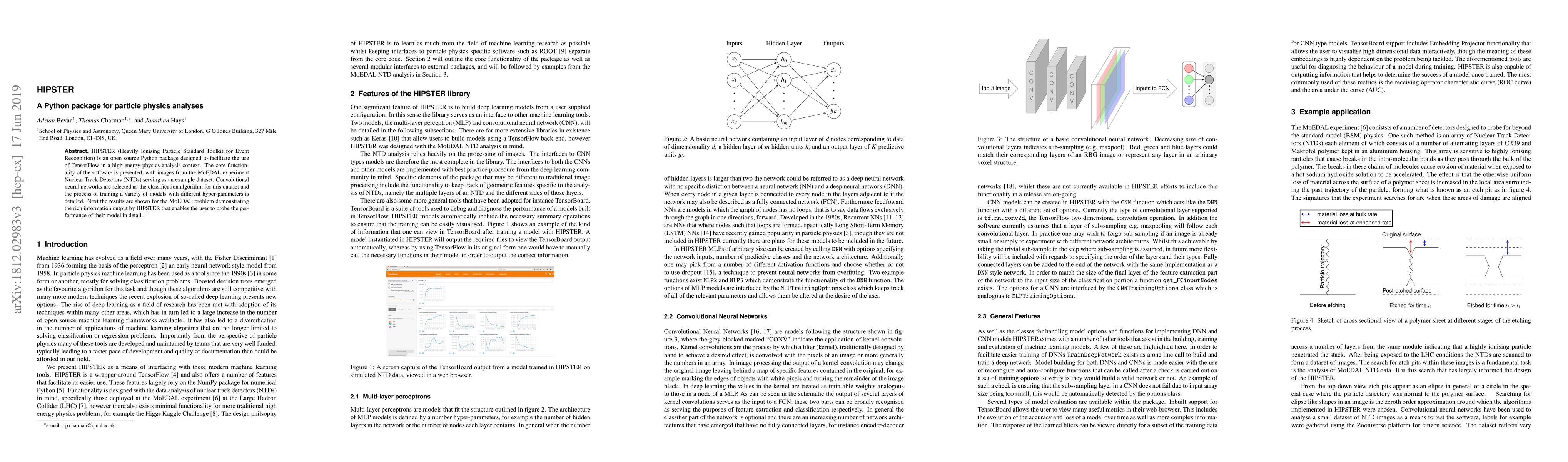 This open-source Python package, HIPSTER, enables detailed analysis of particle physics data using TensorFlow convolutional neural networks. It provides a rich information output for model performance evaluation, as demonstrated in the MoEDAL experiment dataset.