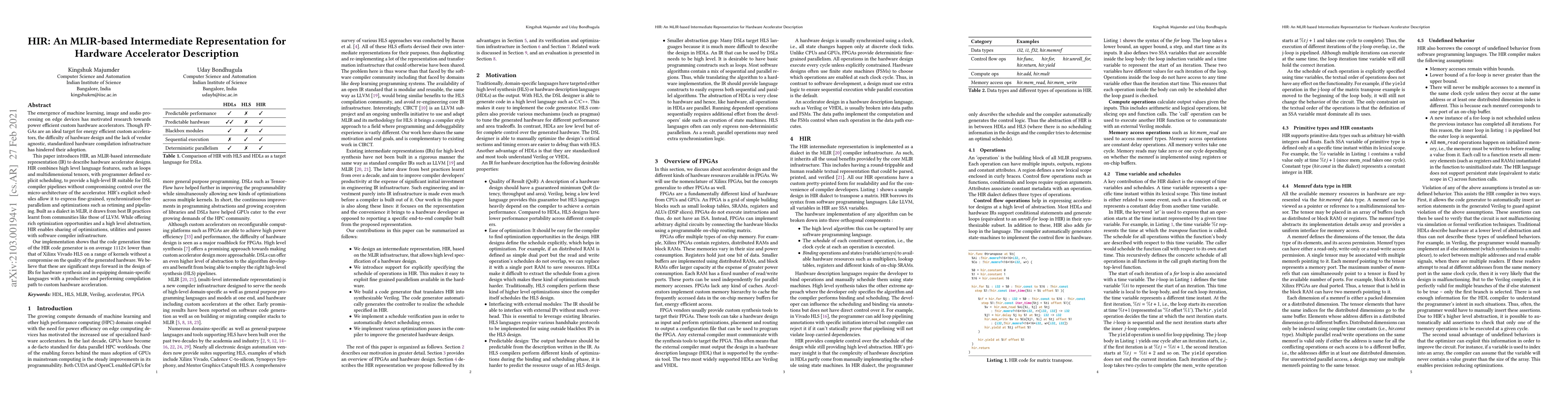 This paper introduces HIR, an MLIR-based intermediate representation designed for describing hardware accelerators, providing high-level abstractions while maintaining control over micro-architecture. The implementation shows significantly faster code generation compared to existing tools, suggesting notable progress in hardware synthesis IRs.