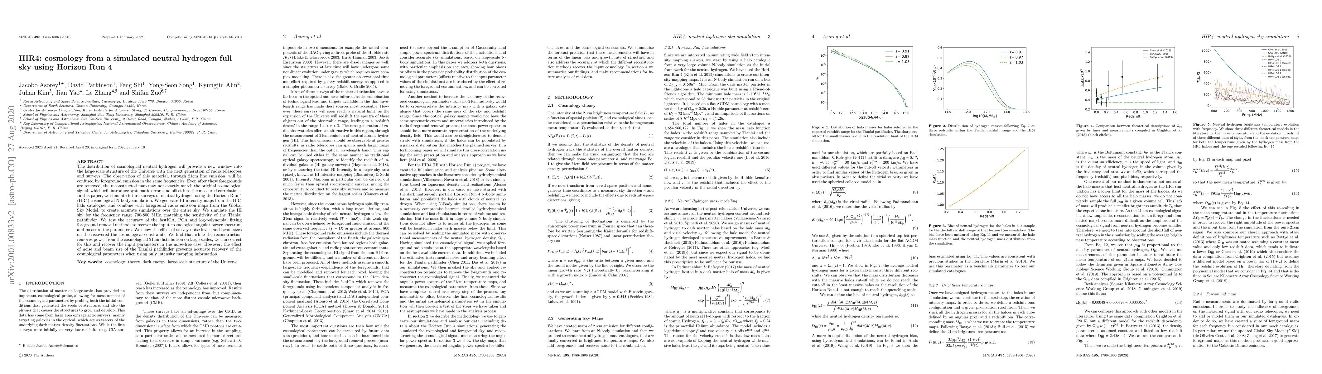 This paper simulates future neutral hydrogen surveys using the Horizon Run 4 cosmological N-body simulation to study the large-scale structure of the Universe. It evaluates the effectiveness of foreground removal methods and assesses the impact of noise and beam size on the recovery of cosmological parameters, finding that while large-scale signals can be recovered, survey limitations hinder precise parameter estimation.