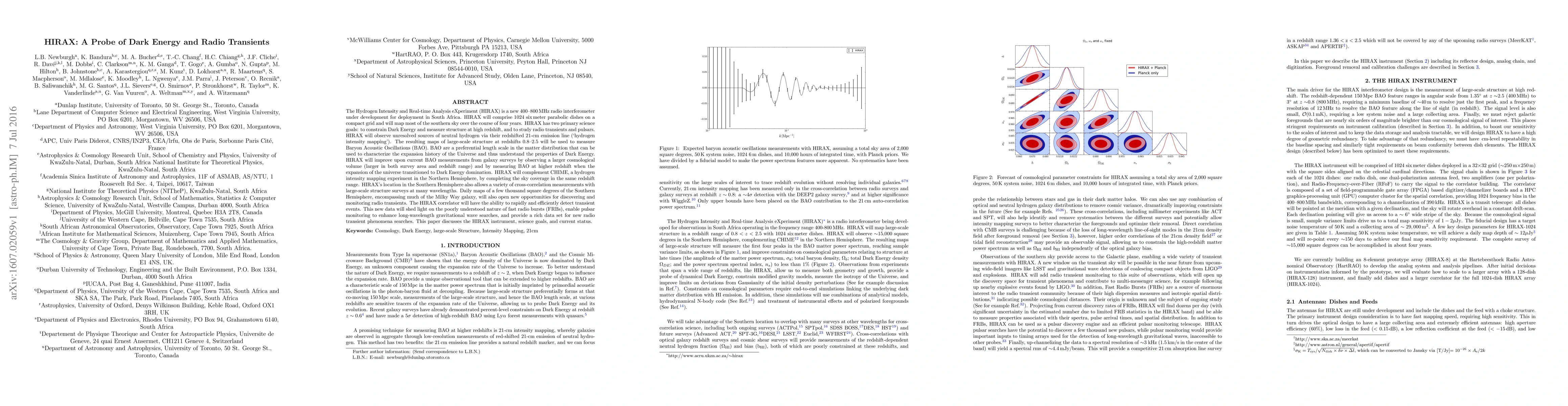 HIRAX is a 400-800MHz radio interferometer designed to map the southern sky and study Dark Energy through Baryon Acoustic Oscillations, while also discovering and monitoring radio transients and pulsars. Its comprehensive sky coverage and high-redshift observations aim to enhance current understanding of the universe's expansion and fast radio bursts.