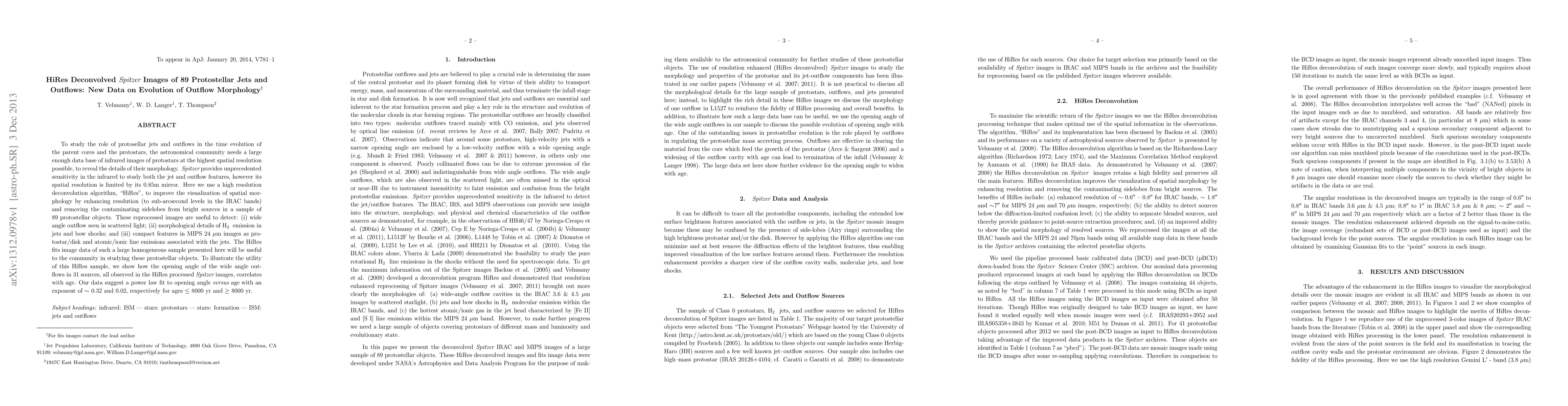 To study the role of protosellar jets and outflows in the time evolution of the parent cores and the protostars, the astronomical community needs a large enough data base of infrared images of protostars at the highest spatial resolution possible, to reveal the details of their morphology. Spitzer provides unprecedented sensitivity in the infrared to study both the jet and outflow features, however its spatial resolution is limited by its 0.85m mirror. Here we use a high resolution deconvolution algorithm, "HiRes", to improve the visualization of spatial morphology by enhancing resolution (to sub-arcsecond levels in the IRAC bands) and removing the contaminating sidelobes from bright sources in a sample of 89 protostellar objects. These reprocessed images are useful to detect: (i) wide angle outflow seen in scattered light; (ii) morphological details of H2 emission in jets and bow shocks; and (iii) compact features in MIPS 24 micron images as protostar/ disk and atomic/ionic line emissions associated with the jets. The HiRes fits image data of such a large homogeneous sample presented here will be useful to the community in studying these protostellar objects. To illustrate the utility of this HiRes sample, we show how the opening angle of the wide angle outflows in 31 sources, all observed in the HiRes processed Spitzer images, correlates with age. Our data suggest a power law fit to opening angle versus age with an exponent of ~0.32 and 0.02, respectively for ages less than 8000 yr and greater than 8000 yr.