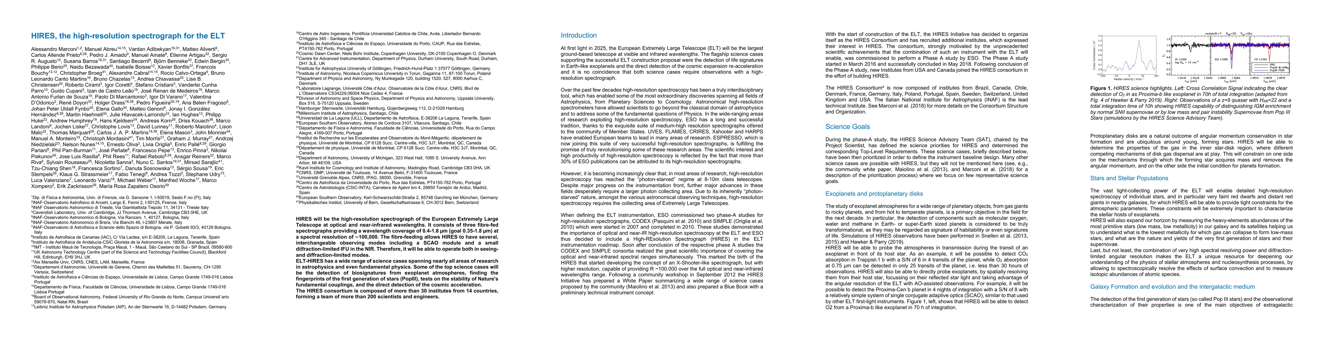 HIRES is a high-resolution spectrograph for the European Extremely Large Telescope, offering versatile observing modes and a broad spectral range. It aims to advance astrophysics and fundamental physics research, including detecting exoplanet atmospheres and cosmic acceleration.