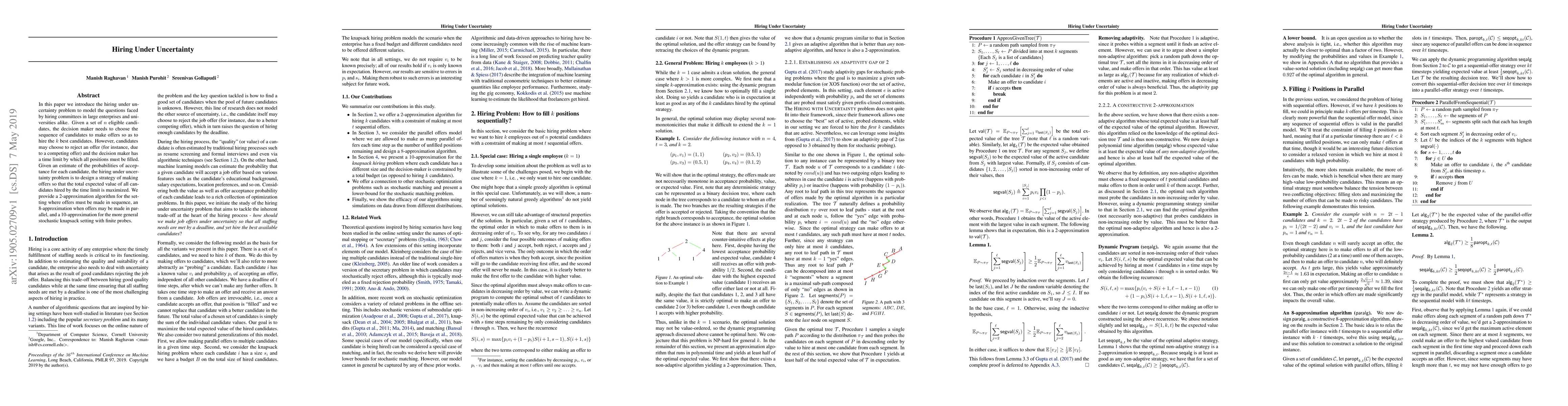 A research paper introduces a hiring under uncertainty problem, which seeks to maximize expected value of hired candidates within a time limit, and proposes 2-approximation, 8-approximation, and 10-approximation algorithms for different scenarios.