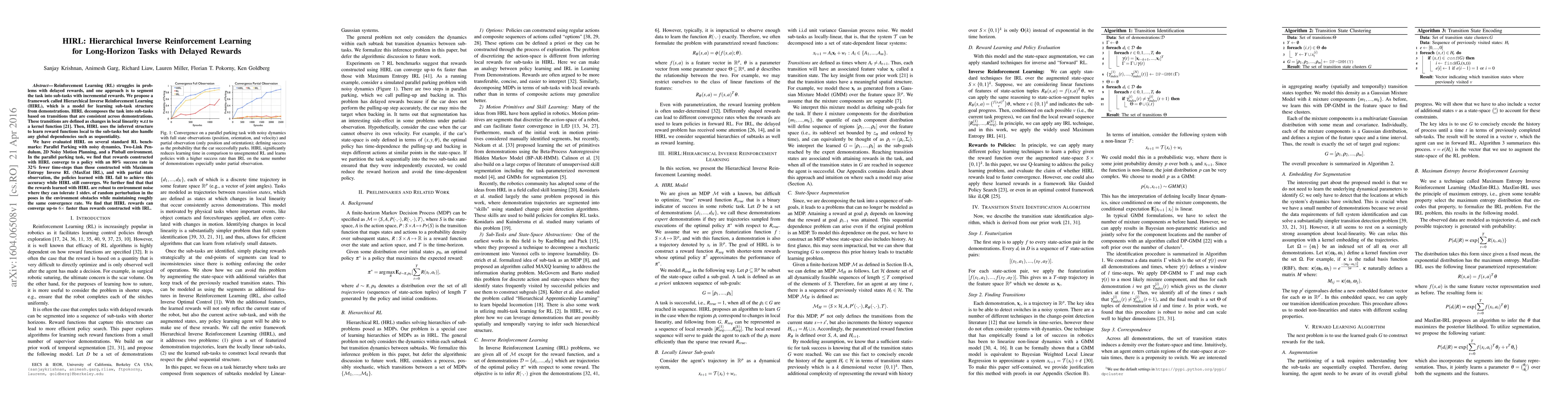 The paper proposes Hierarchical Inverse Reinforcement Learning (HIRL) to tackle long-horizon tasks with delayed rewards by segmenting tasks into sub-tasks with incremental rewards. HIRL decomposes tasks based on consistent transitions across demonstrations, learning local and global reward functions, and demonstrates superior performance on several RL benchmarks, achieving up to 6x faster convergence compared to traditional methods.