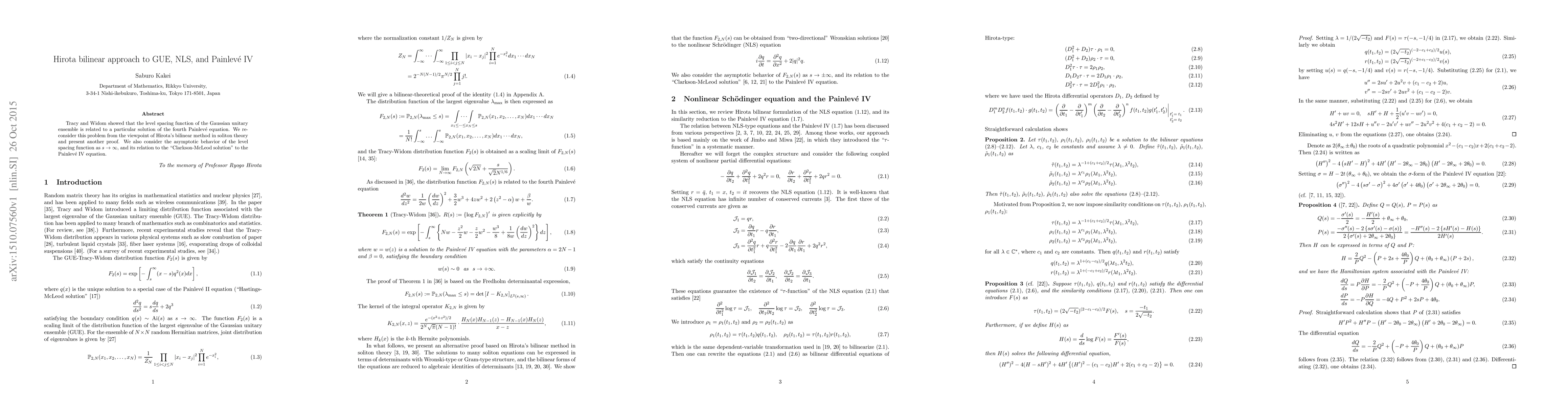 This paper presents an alternative proof for the relationship between the level spacing function of the Gaussian unitary ensemble and a solution of the fourth Painlev'e equation, using Hirota's bilinear method. It also explores the asymptotic behavior of the level spacing function and its connection to the Clarkson-McLeod solution of Painlev'e IV.