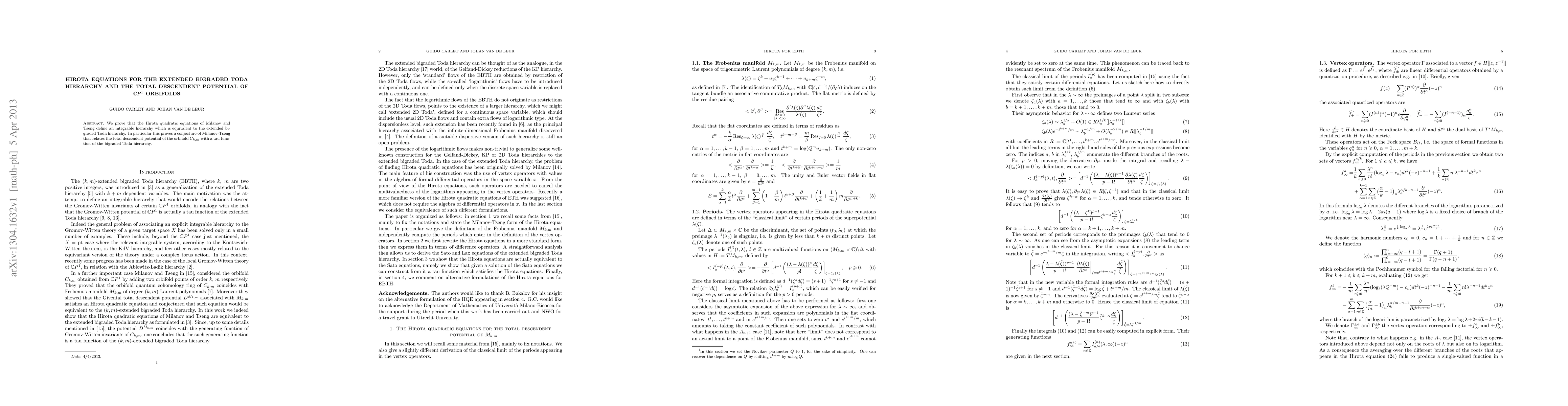 Summary: This paper establishes that the Hirota quadratic equations form an integrable hierarchy equivalent to the extended bigraded Toda hierarchy, confirming a conjecture linking the total descendent potential of CP^1 orbifolds to a tau function in the Toda hierarchy.