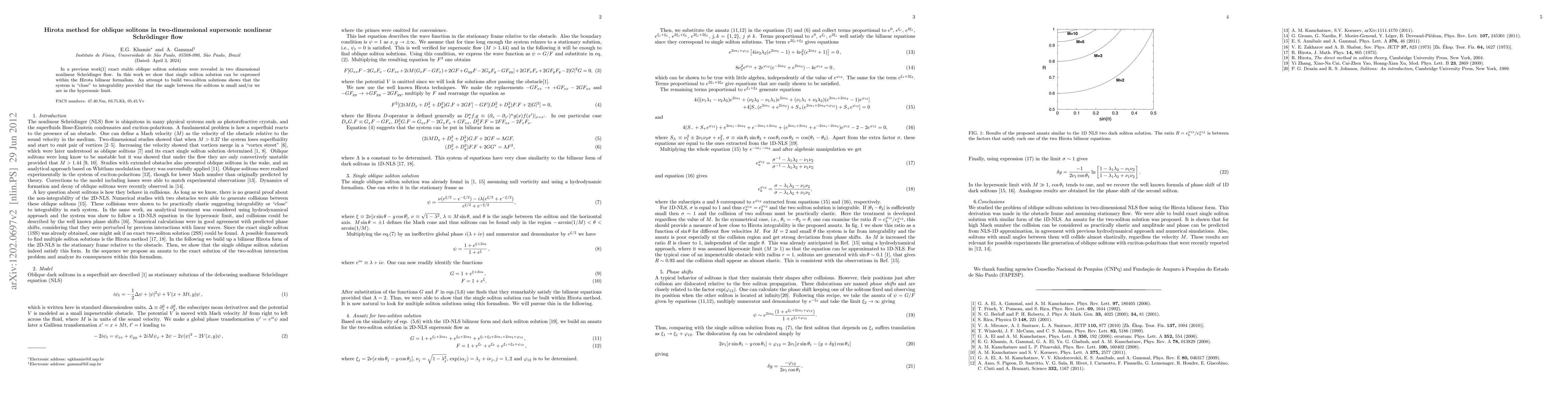 This paper applies the Hirota method to express single soliton solutions in two-dimensional supersonic nonlinear Schrödinger flow, revealing that the system approaches integrability under small soliton angles or in the hypersonic limit. Two-soliton solutions are also explored, indicating near-integrability conditions.
