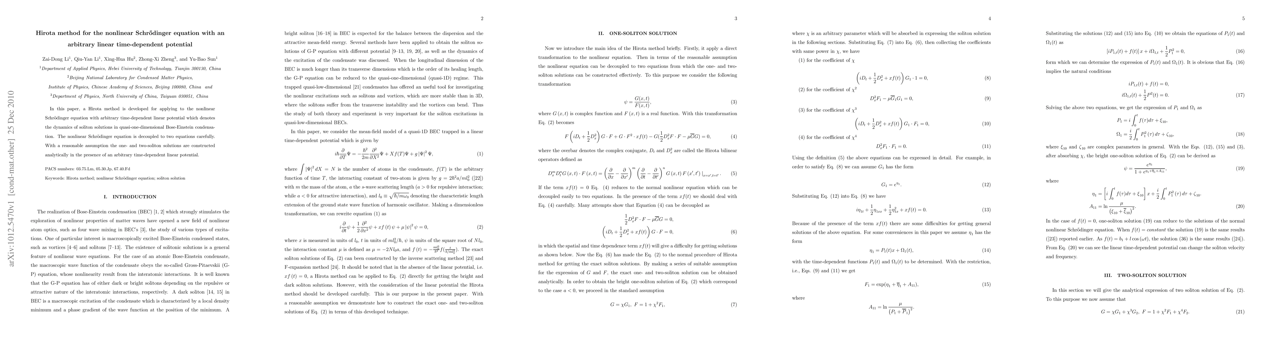 This paper develops a Hirota method to solve the nonlinear Schrödinger equation with an arbitrary linear time-dependent potential, focusing on soliton dynamics in quasi-one-dimensional Bose-Einstein condensates. Analytical one- and two-soliton solutions are constructed under reasonable assumptions.