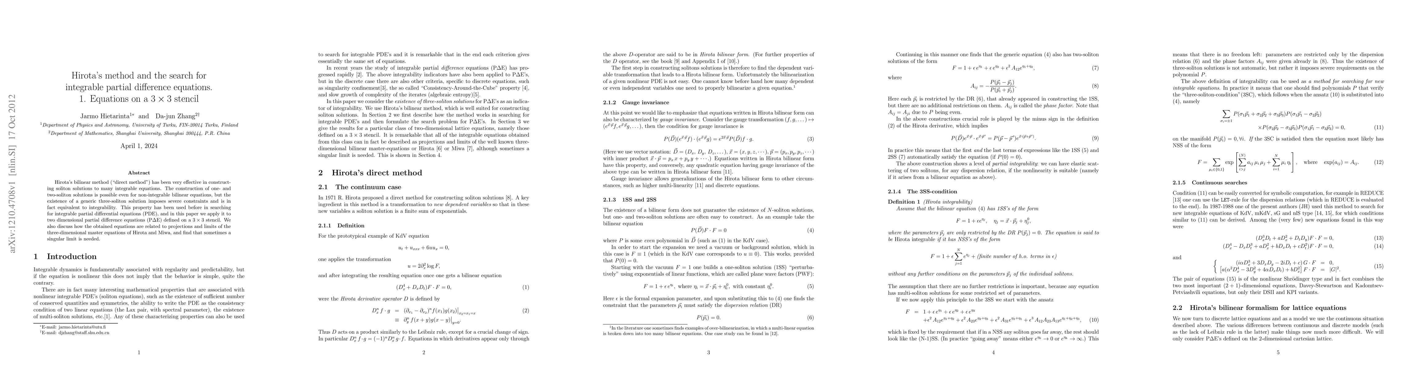 This paper applies Hirota's bilinear method to construct integrable partial difference equations on a 3x3 stencil, leveraging the property that the existence of a three-soliton solution is equivalent to integrability. The study also explores the relationship between these equations and three-dimensional master equations, noting the necessity of singular limits in some cases.