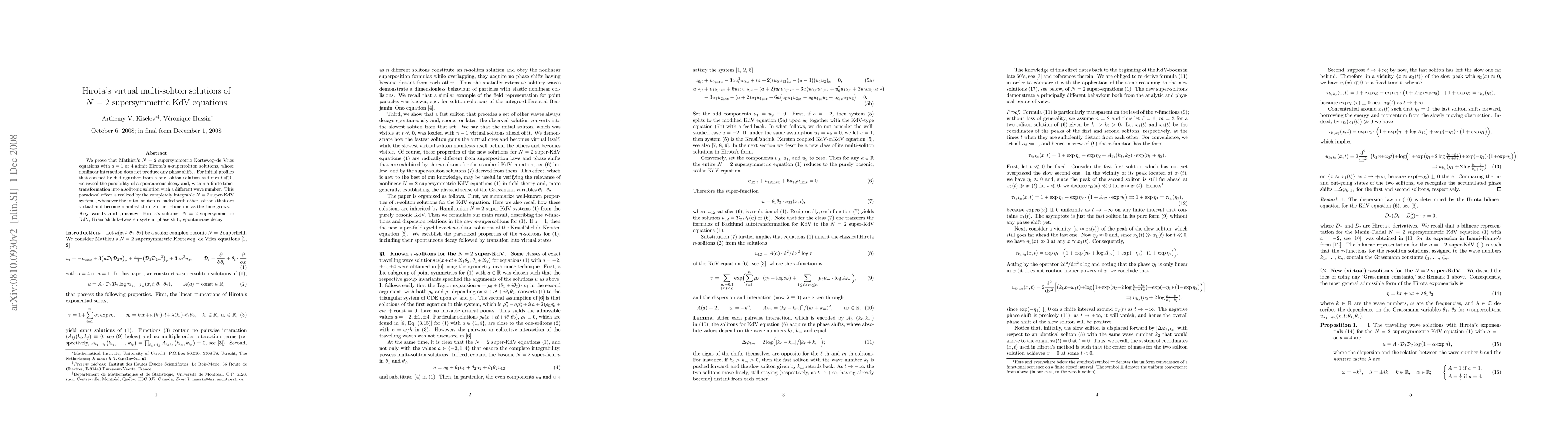 Researchers prove that certain N=2 supersymmetric Korteweg-de Vries equations can create solitons without phase shifts, which then decay into different solutions over time.