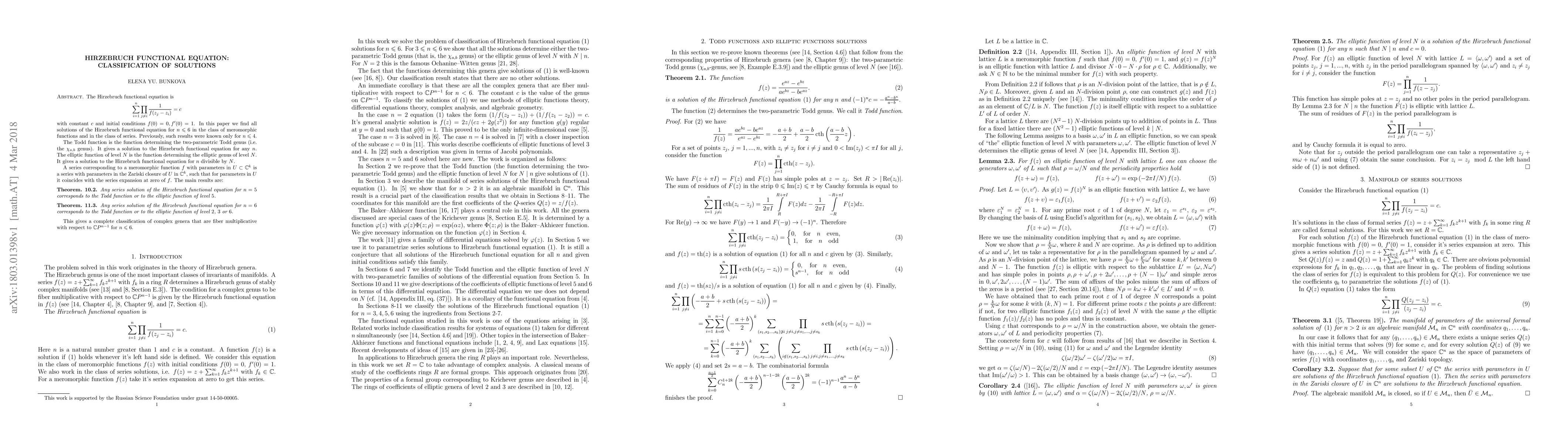This paper classifies all meromorphic solutions and series solutions to the Hirzebruch functional equation for $n \leqslant 6$, expanding prior results up to $n \leqslant 4$. It identifies the Todd function and elliptic functions as solutions, providing a complete classification for complex genera up to $n = 6$.