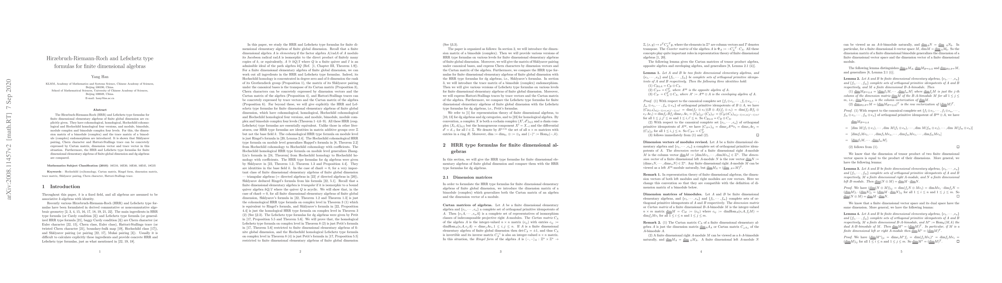 This paper explicitly derives Hirzebruch-Riemann-Roch and Lefschetz type formulas for finite-dimensional elementary algebras, providing four versions based on cohomological and homological perspectives, and introducing dimension and trace matrices for bimodules and complexes. It also compares these results to those for dg algebras.
