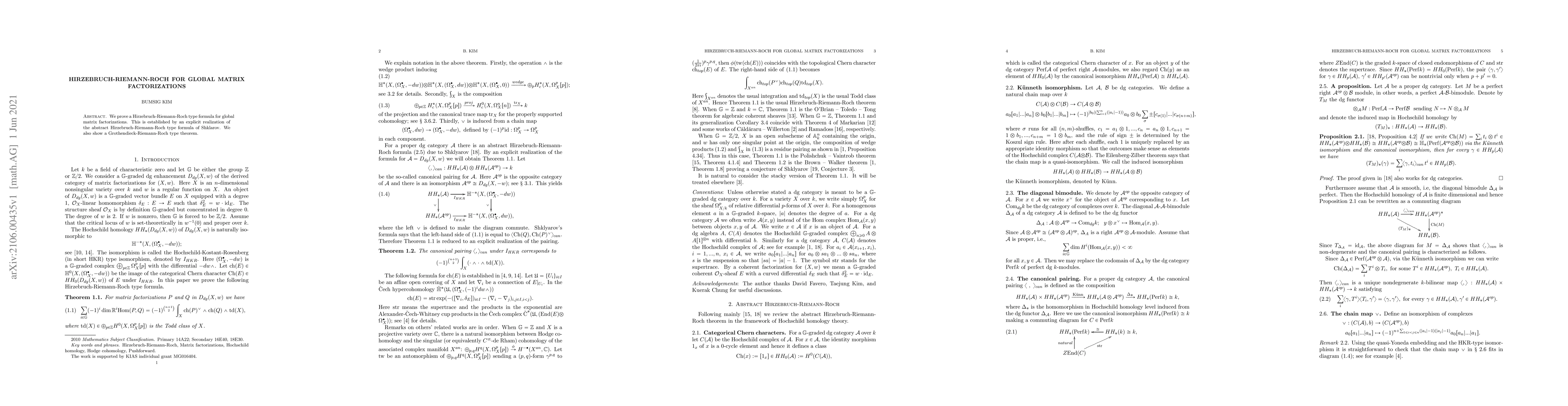 This paper proves a Hirzebruch-Riemann-Roch type formula for global matrix factorizations, providing an explicit realization of Shklarov's abstract formula, and also establishes a Grothendieck-Riemann-Roch type theorem.