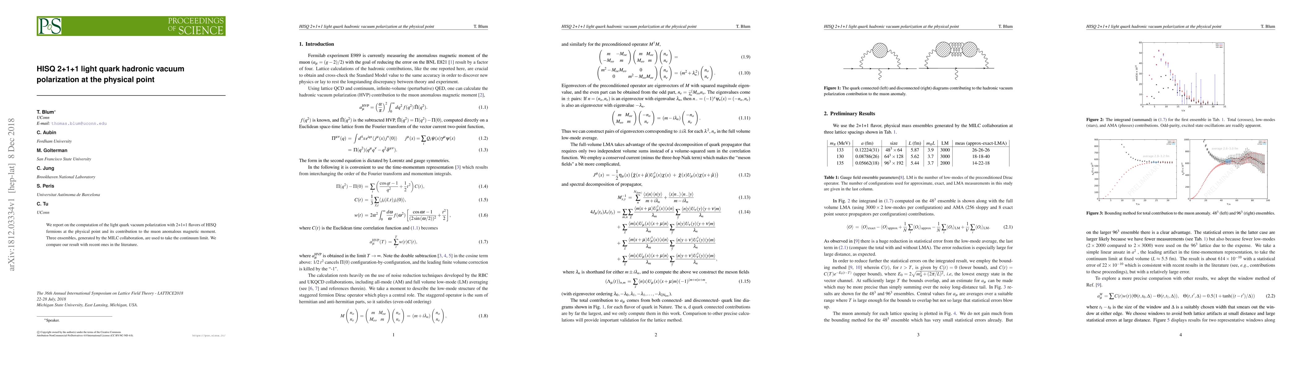 The research employs lattice QCD calculations using 2+1+1 flavors of HISQ fermions with three ensembles from the MILC collaboration to compute the light quark vacuum polarization at the physical point and its contribution to the muon anomalous magnetic moment, taking the continuum limit.