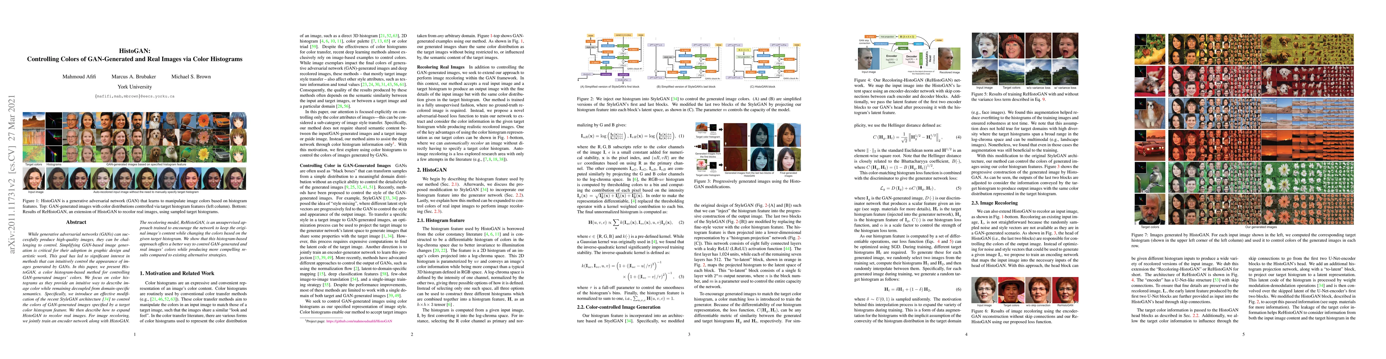 HistoGAN introduces a method to control the colors of GAN-generated and real images through color histograms, enhancing intuitive image generation and recoloring. It modifies StyleGAN architecture and jointly trains an encoder network for effective color manipulation, outperforming existing strategies.
