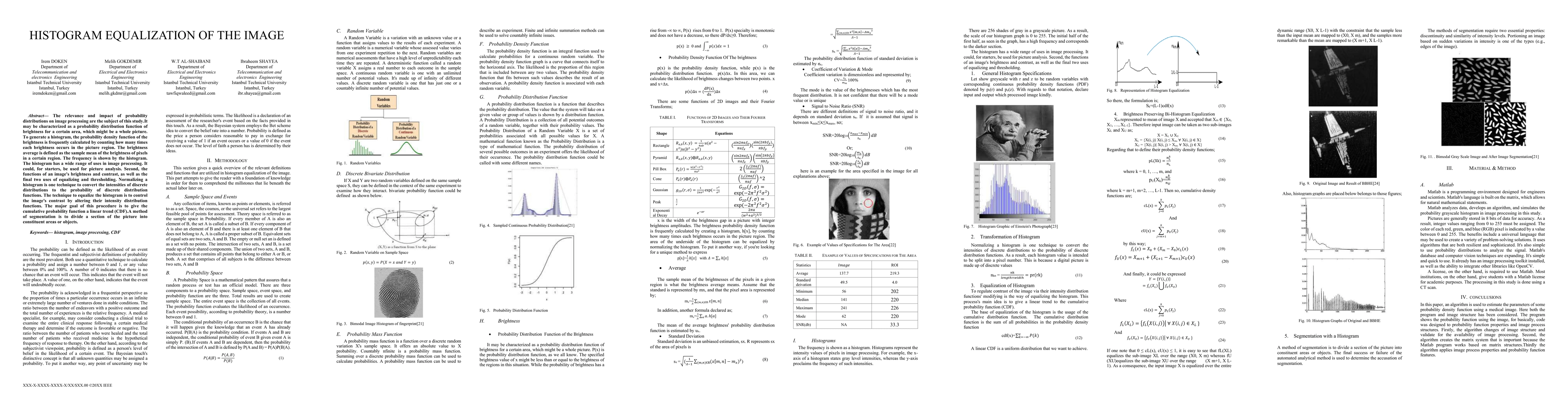 The relevance and impact of probability distributions on image processing are the subject of this study.It may be characterized as a probability distribution function of brightness for a certain area, which might be a whole picture. To generate a histogram, the probability density function of the brightness is frequently calculated by counting how many times each brightness occurs in the picture region. The brightness average is defined as the sample mean of the brightness of pixels in a certain region. The frequency is shown by the histogram. The histogram has a wide range of uses in image processing. It could, for starters, be used for picture analysis. Second, the functions of an image's brightness and contrast, as well as the final two uses of equalizing and thresholding. Normalizing a histogram is one technique to convert the intensities of discrete distributions to the probability of discrete distribution functions. The technique to equalize the histogram is to control the image's contrast by altering their intensity distribution functions. The major goal of this procedure is to give the cumulative probability function a linear trend (CDF).A method of segmentation is to divide a section of the picture into constituent areas or objects.