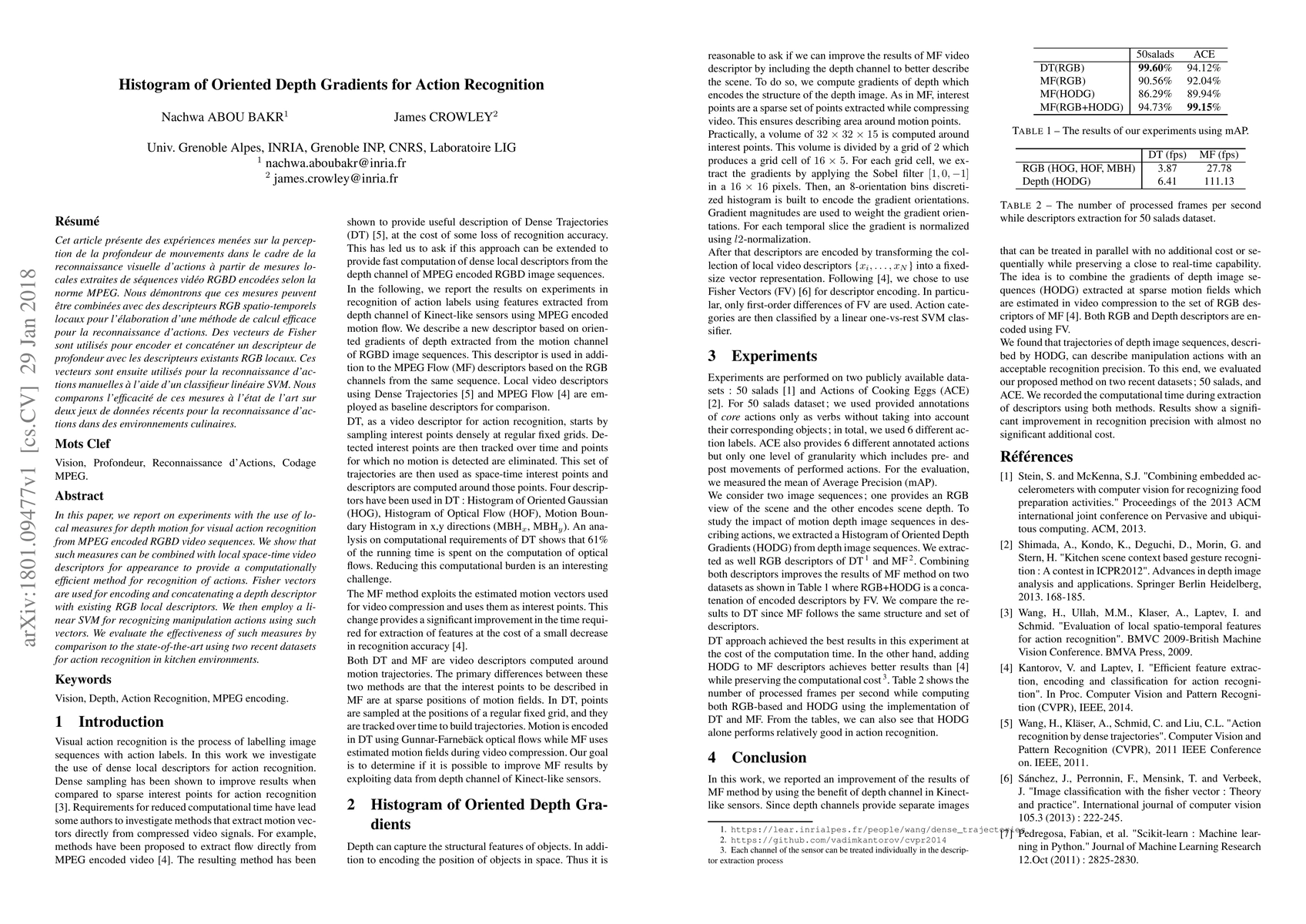 This paper proposes a method for action recognition using Histogram of Oriented Depth Gradients (HODG) combined with local space-time descriptors for appearance. It employs Fisher vectors to encode and concatenate depth and RGB descriptors, followed by a linear SVM for action recognition, demonstrating effectiveness against state-of-the-art methods on kitchen environment datasets.