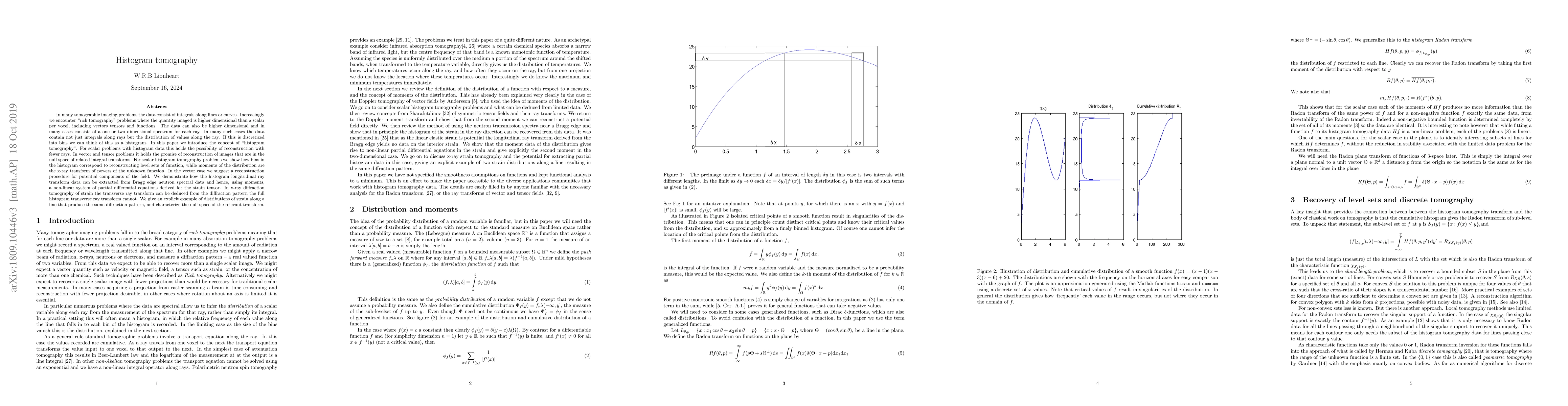 In many tomographic imaging problems the data consist of integrals along lines or curves. Increasingly we encounter "rich tomography" problems where the quantity imaged is higher dimensional than a scalar per voxel, including vectors tensors and functions. The data can also be higher dimensional and in many cases consists of a one or two dimensional spectrum for each ray. In many such cases the data contain not just integrals along rays but the distribution of values along the ray. If this is discretized into bins we can think of this as a histogram. In this paper we introduce the concept of "histogram tomography". For scalar problems with histogram data this holds the possibility of reconstruction with fewer rays. In vector and tensor problems it holds the promise of reconstruction of images that are in the null space of related integral transforms. For scalar histogram tomography problems we show how bins in the histogram correspond to reconstructing level sets of function, while moments of the distribution are the x-ray transform of powers of the unknown function. In the vector case we give a reconstruction procedure for potential components of the field. We demonstrate how the histogram longitudinal ray transform data can be extracted from Bragg edge neutron spectral data and hence, using moments, a non-linear system of partial differential equations derived for the strain tensor. In x-ray diffraction tomography of strain the transverse ray transform can be deduced from the diffraction pattern the full histogram transverse ray transform cannot. We give an explicit example of distributions of strain along a line that produce the same diffraction pattern, and characterize the null space of the relevant transform.