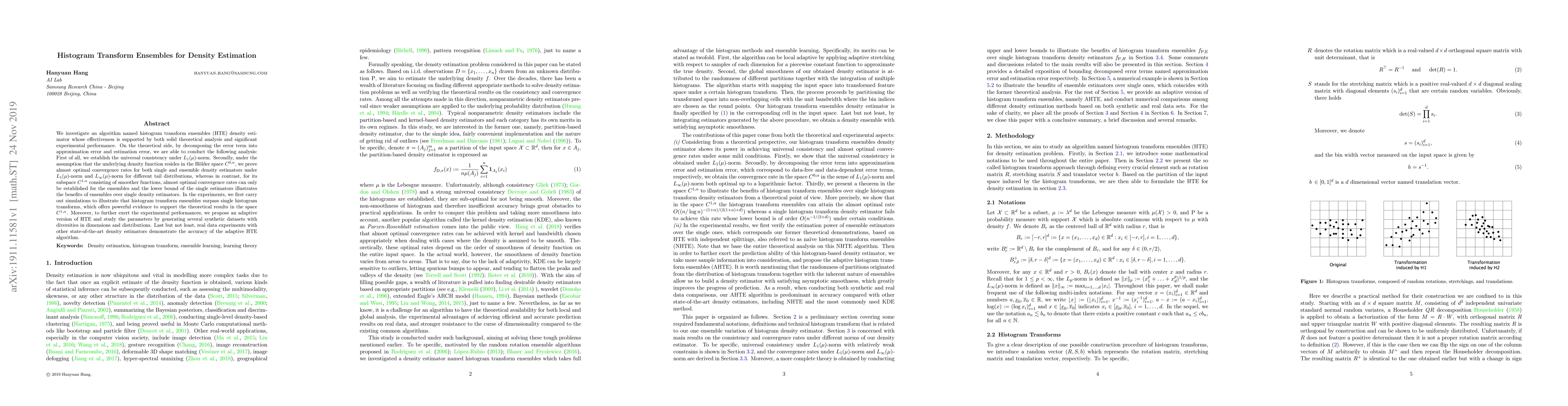 This paper introduces histogram transform ensembles (HTE) for density estimation, proving their theoretical consistency and optimal convergence rates under various norms. Experimental results show HTE outperforms single histogram transforms and an adaptive version of HTE performs well on both synthetic and real datasets.