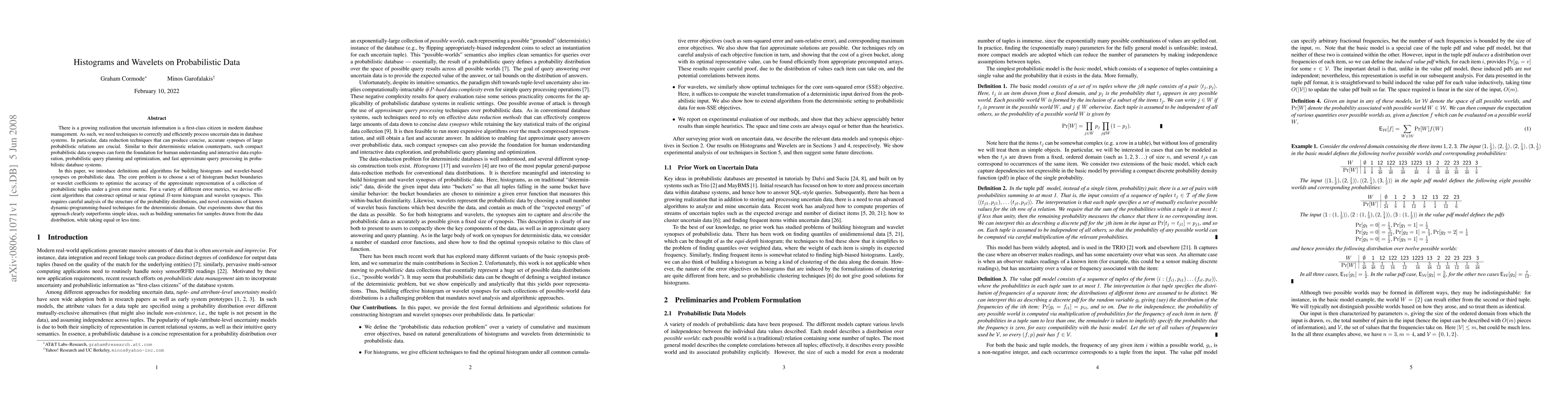 This paper introduces algorithms for constructing histogram and wavelet synopses on probabilistic data to efficiently represent large collections of uncertain information. The proposed methods outperform simple sampling-based approaches by optimizing the accuracy of the summaries under various error metrics, leveraging dynamic programming techniques adapted for probabilistic distributions.