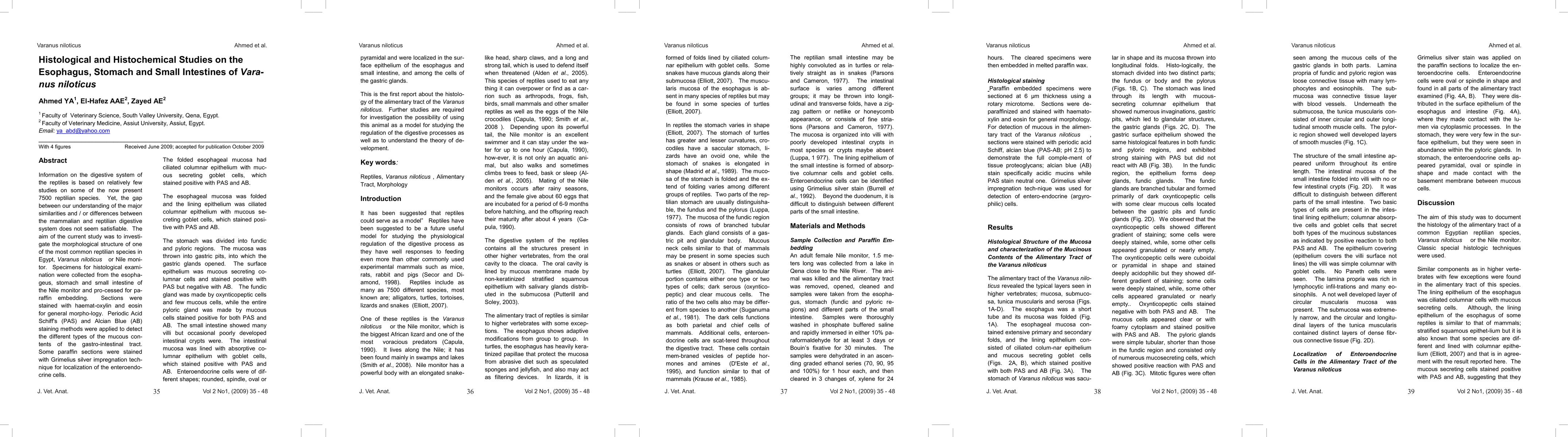 The aim of the current study was to investigate the morphological structure of one of the most common reptilian species in Egypt, Varanus niloticus or Nile monitor. Specimens for histological examination were collected from the esophageus, stomach and small intestine of the Nile monitor and processed for paraffin embedding. Sections were stained with haematoxylin and eosin for general morphology. Periodic Acid Schiff's (PAS) and Alcian Blue (AB) staining methods were applied to detect the different types of the mucous con-tents of the gastro-intestinal tract. Some paraffin sections were stained with Grimelius silver impregnation technique for localization of the enteroendocrine cells. The folded esophageal mucosa had ciliated columnar epithelium with mucous secreting goblet cells, which stained positive with PAS and AB. The esophageal mucosa was folded and the lining epithelium was ciliated columnar epithelium with mucous secreting goblet cells, which stained positive with PAS and AB. The stomach was divided into fundic and pyloric regions. The mucosa was thrown into gastric pits, into which the gastric glands opened. The surface epithelium was mucous secreting columnar cells and stained positive with PAS but negative with AB. The fundic gland was made by oxynticopeptic cells and few mucous cells, while the entire pyloric gland was made by mucous cells stained positive for both PAS and AB. The small intestine showed many villi but occasional poorly developed intestinal crypts were. The intestinal mucosa was lined with absorptive columnar epithelium with goblet cells, which stained positive with PAS and AB. Enteroendocrine cells were of different shapes; rounded, spindle, oval or pyramidal and were localized in the surface epithelium of the esophagus and small intestine, and among the cells of the gastric glands.