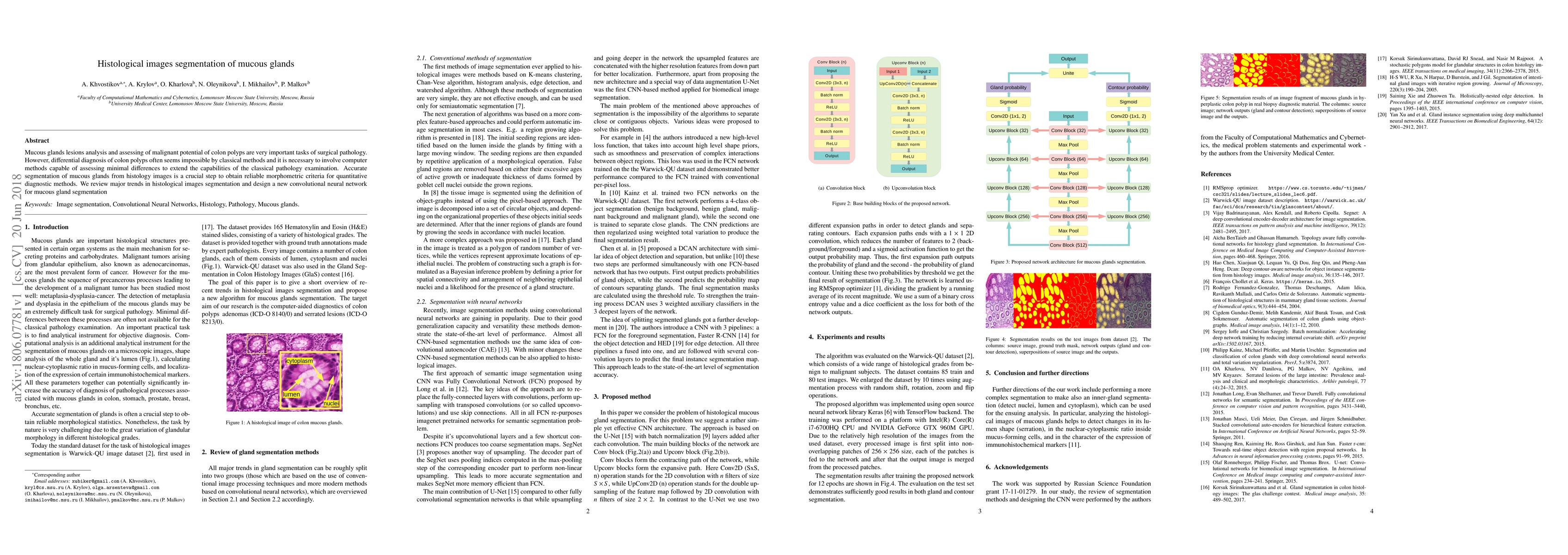 Mucous glands lesions analysis and assessing of malignant potential of colon polyps are very important tasks of surgical pathology. However, differential diagnosis of colon polyps often seems impossible by classical methods and it is necessary to involve computer methods capable of assessing minimal differences to extend the capabilities of the classical pathology examination. Accurate segmentation of mucous glands from histology images is a crucial step to obtain reliable morphometric criteria for quantitative diagnostic methods. We review major trends in histological images segmentation and design a new convolutional neural network for mucous gland segmentation.