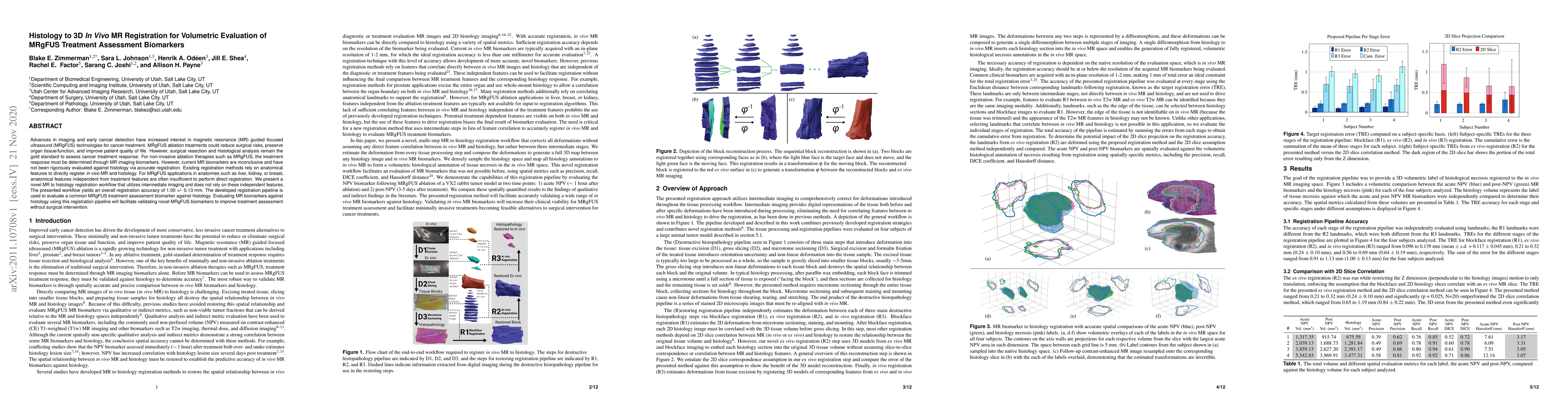 This paper presents a novel workflow for registering in vivo MR images to histology for evaluating MRgFUS treatment biomarkers, achieving an accuracy of 1.00 +/- 0.13 mm. The method aims to improve non-invasive assessment of MRgFUS treatments by validating MR biomarkers against histology without surgical resection.
