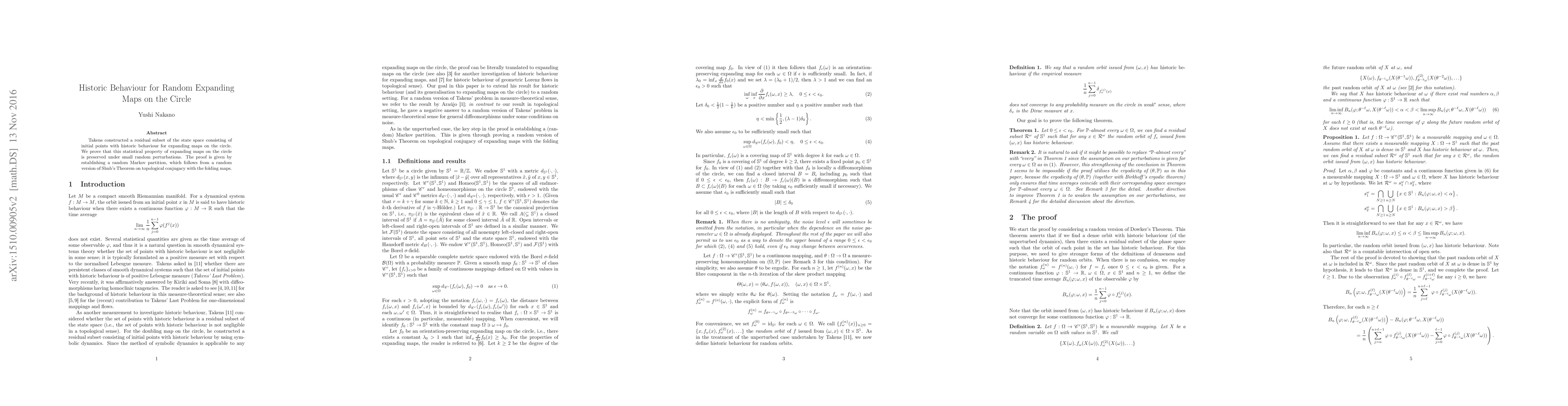 This paper proves that the statistical property of historic behavior in expanding maps on the circle, as constructed by Takens, remains intact under small random perturbations. The proof utilizes a random Markov partition derived from a random version of Shub's Theorem on topological conjugacy with folding maps.