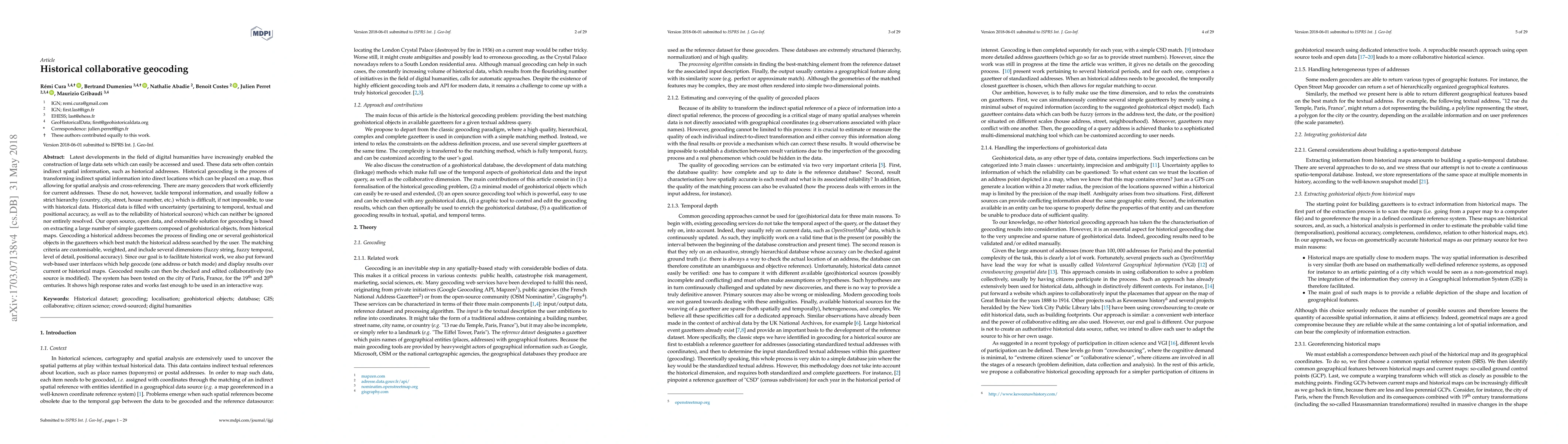 The latest developments in digital have provided large data sets that can increasingly easily be accessed and used. These data sets often contain indirect localisation information, such as historical addresses. Historical geocoding is the process of transforming the indirect localisation information to direct localisation that can be placed on a map, which enables spatial analysis and cross-referencing. Many efficient geocoders exist for current addresses, but they do not deal with the temporal aspect and are based on a strict hierarchy (..., city, street, house number) that is hard or impossible to use with historical data. Indeed historical data are full of uncertainties (temporal aspect, semantic aspect, spatial precision, confidence in historical source, ...) that can not be resolved, as there is no way to go back in time to check. We propose an open source, open data, extensible solution for geocoding that is based on the building of gazetteers composed of geohistorical objects extracted from historical topographical maps. Once the gazetteers are available, geocoding an historical address is a matter of finding the geohistorical object in the gazetteers that is the best match to the historical address. The matching criteriae are customisable and include several dimensions (fuzzy semantic, fuzzy temporal, scale, spatial precision ...). As the goal is to facilitate historical work, we also propose web-based user interfaces that help geocode (one address or batch mode) and display over current or historical topographical maps, so that they can be checked and collaboratively edited. The system is tested on Paris city for the 19-20th centuries, shows high returns rate and is fast enough to be used interactively.