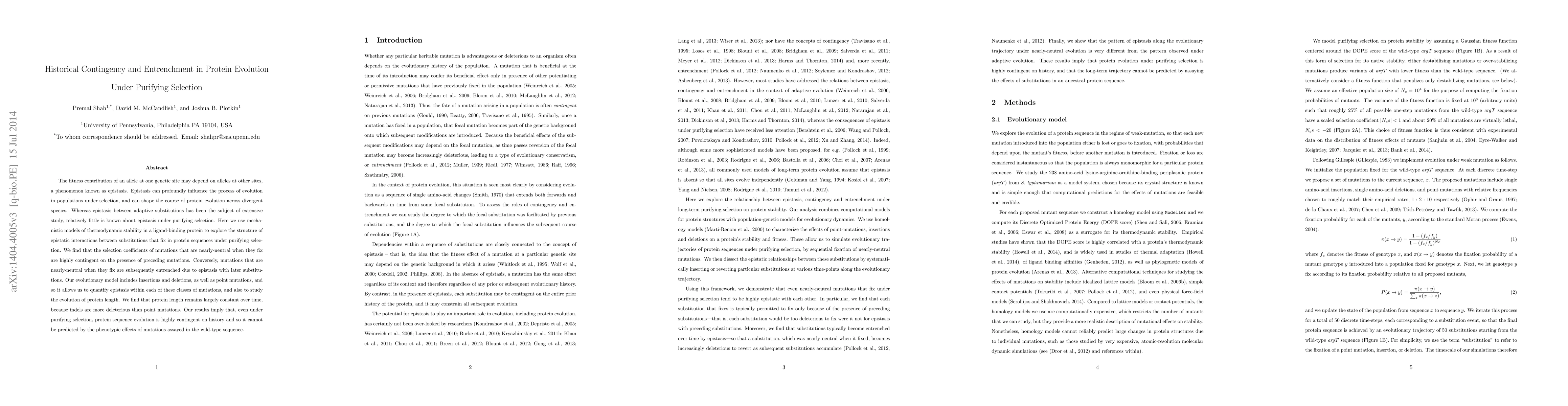 The fitness contribution of an allele at one genetic site may depend on alleles at other sites, a phenomenon known as epistasis. Epistasis can profoundly influence the process of evolution in populations under selection, and can shape the course of protein evolution across divergent species. Whereas epistasis between adaptive substitutions has been the subject of extensive study, relatively little is known about epistasis under purifying selection. Here we use mechanistic models of thermodynamic stability in a ligand-binding protein to explore the structure of epistatic interactions between substitutions that fix in protein sequences under purifying selection. We find that the selection coefficients of mutations that are nearly-neutral when they fix are highly contingent on the presence of preceding mutations. Conversely, mutations that are nearly-neutral when they fix are subsequently entrenched due to epistasis with later substitutions. Our evolutionary model includes insertions and deletions, as well as point mutations, and so it allows us to quantify epistasis within each of these classes of mutations, and also to study the evolution of protein length. We find that protein length remains largely constant over time, because indels are more deleterious than point mutations. Our results imply that, even under purifying selection, protein sequence evolution is highly contingent on history and so it cannot be predicted by the phenotypic effects of mutations assayed in the wild-type sequence.