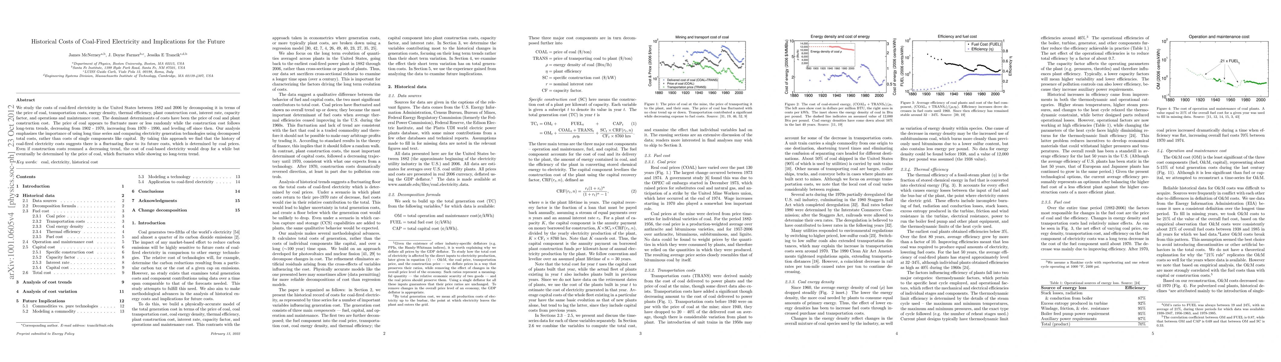 This paper analyzes historical costs of coal-fired electricity in the U.S. from 1882 to 2006, finding that coal price and construction costs are the main determinants. The study suggests that future costs will fluctuate based on coal prices, indicating a fluctuating floor rather than a long-term trend.