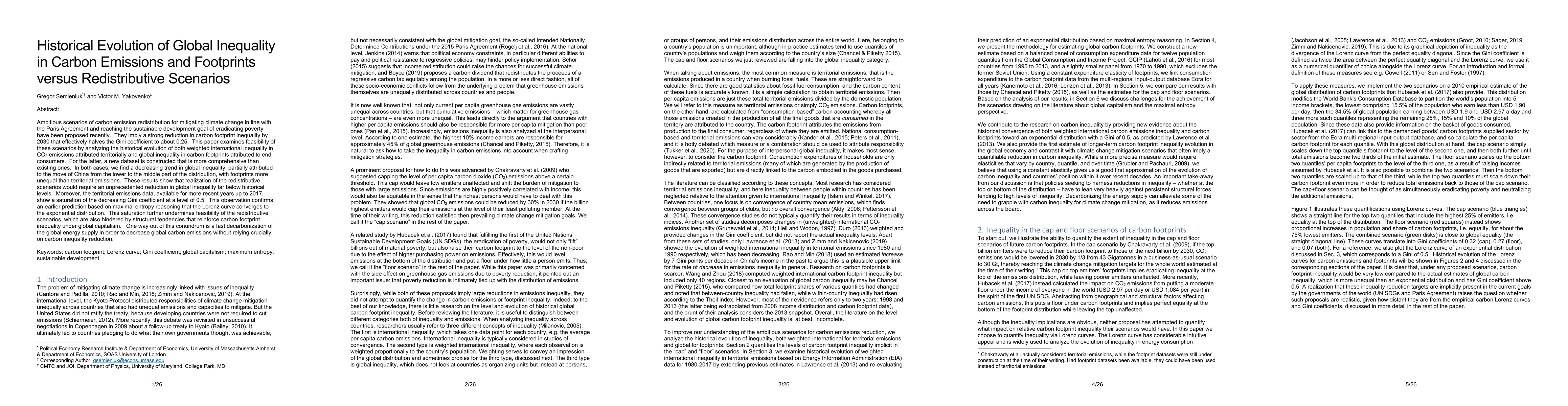 This paper investigates the historical trends in global inequality of carbon emissions and footprints, finding a decreasing trend but noting a saturation in territorial emissions inequality. It concludes that ambitious redistributive scenarios for climate mitigation are unlikely due to structural tendencies reinforcing inequality, suggesting fast decarbonization as a viable alternative.