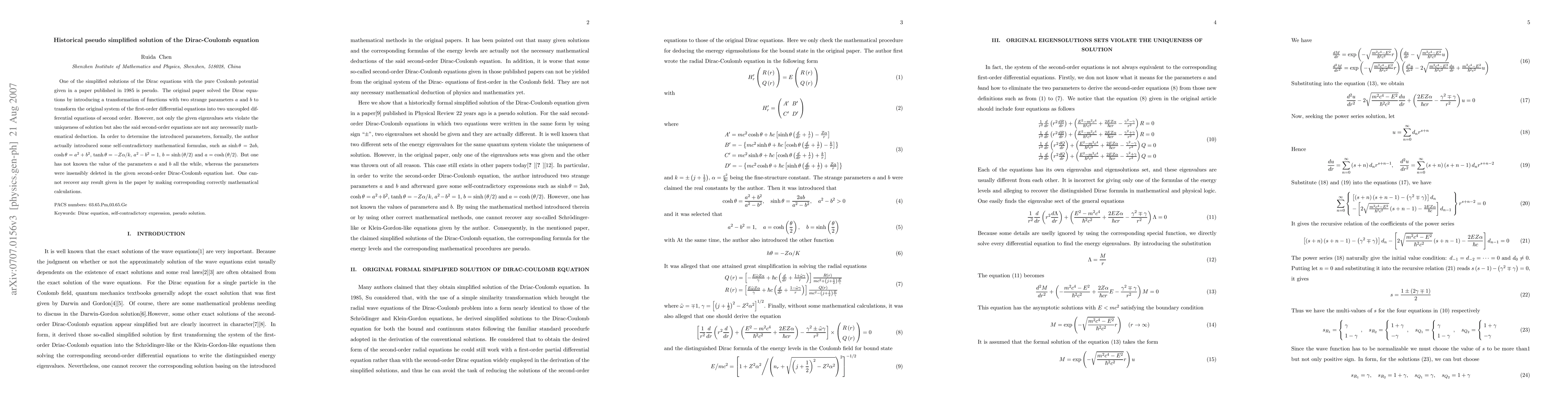 One of the simplified solutions of the Dirac equations with the pure Coulomb potential given in a paper published in 1985 is pseudo. The original paper solved the Dirac equations by introducing a transformation of functions with two strange parameters a and b to transform the original system of the first-order differential equations into two uncoupled differential equations of second order. However, not only the given eigenvalues sets violate the uniqueness of solution but also the said second-order equations are not any necessarily mathematical deduction. In order to determine the introduced parameters, formally, the author actually introduced some self-contradictory mathematical formulas, such as sinh(theta)=2ab, cosh(theta)=a^2+b^2, tanh(theta)=-Z(alpha)/k, a^2-b^2=1, b=sinh((theta/2), a=cosh((theta/2). But one has not known the value of the parameters a and b all the while, whereas the parameters were insensibly deleted in the given second-order Dirac-Coulomb equation last. One cannot recover any result given in the paper by making corresponding correctly mathematical calculations.