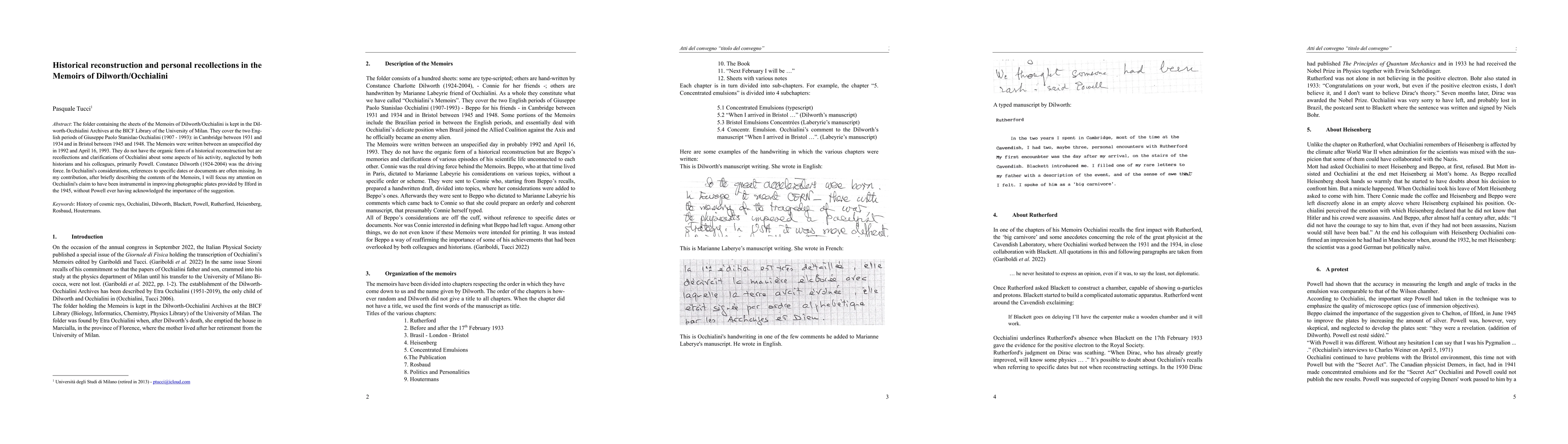 This paper examines the Memoirs of Dilworth/Occhialini, kept in the University of Milan's library, focusing on Giuseppe Occhialini's recollections of his time in Cambridge and Bristol. It highlights Occhialini's claim of significant contributions to photographic plates in 1945, which he asserts were overlooked by his colleagues, particularly Powell.