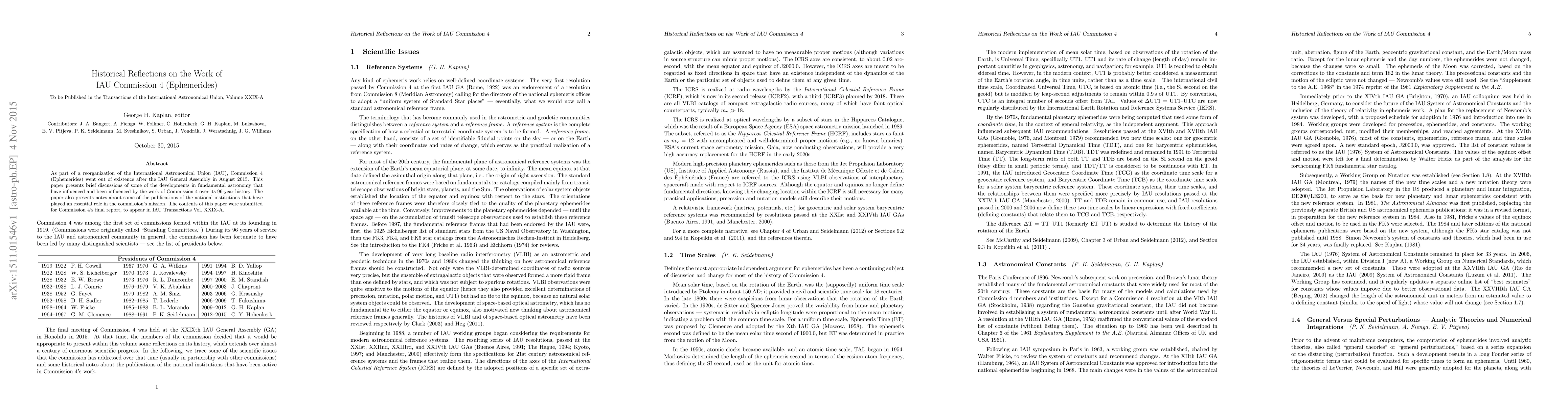 As part of a reorganization of the International Astronomical Union (IAU), Commission 4 (Ephemerides) went out of existence after the IAU General Assembly in August 2015. This paper presents brief discussions of some of the developments in fundamental astronomy that have influenced and been influenced by the work of Commission 4 over its 96-year history. The paper also presents notes about some of the publications of the national institutions that have played an essential role in the commission's mission. The contents of this paper were submitted for Commission 4's final report, to appear in IAU Transactions Vol. XXIX-A.
