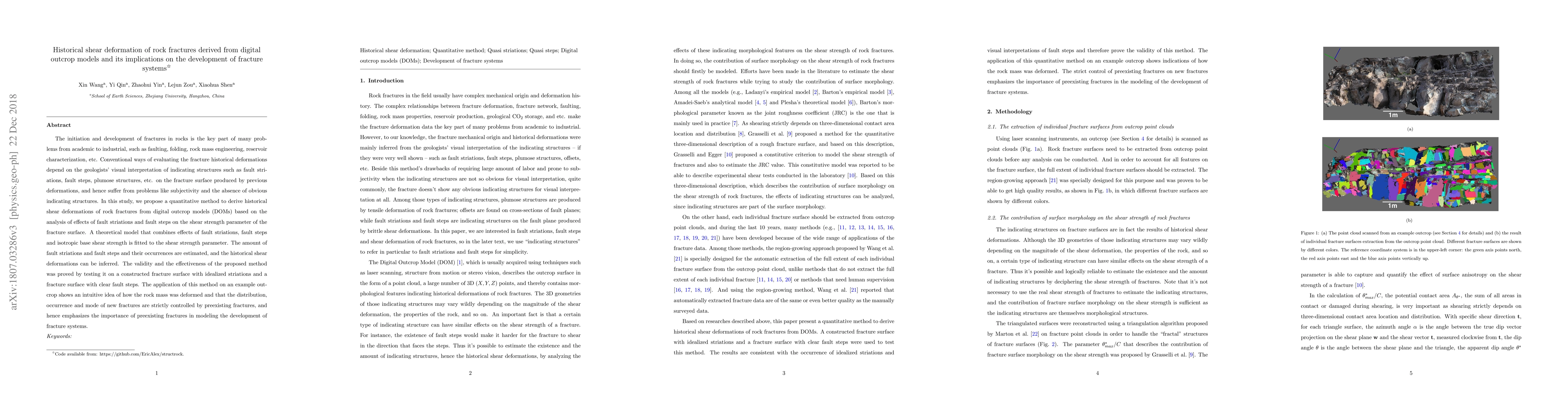 The initiation and development of fractures in rocks is the key part of many problems from academic to industrial, such as faulting, folding, rock mass engineering, reservoir characterization, etc. Conventional ways of evaluating the fracture historical deformations depend on the geologists' visual interpretation of indicating structures such as fault striations, fault steps, plumose structures, etc. on the fracture surface produced by previous deformations, and hence suffer from problems like subjectivity and the absence of obvious indicating structures. In this study, we propose a quantitative method to derive historical shear deformations of rock fractures from digital outcrop models (DOMs) based on the analysis of effects of fault striations and fault steps on the shear strength parameter of the fracture surface. A theoretical model that combines effects of fault striations, fault steps and isotropic base shear strength is fitted to the shear strength parameter. The amount of fault striations and fault steps and their occurrences are estimated, and the historical shear deformations can be inferred. The validity and the effectiveness of the proposed method was proved by testing it on a constructed fracture surface with idealized striations and a fracture surface with clear fault steps. The application of this method on an example outcrop shows an intuitive idea of how the rock mass was deformed and that the distribution, occurrence and mode of new fractures are strictly controlled by preexisting fractures, and hence emphasizes the importance of preexisting fractures in modeling the development of fracture systems.